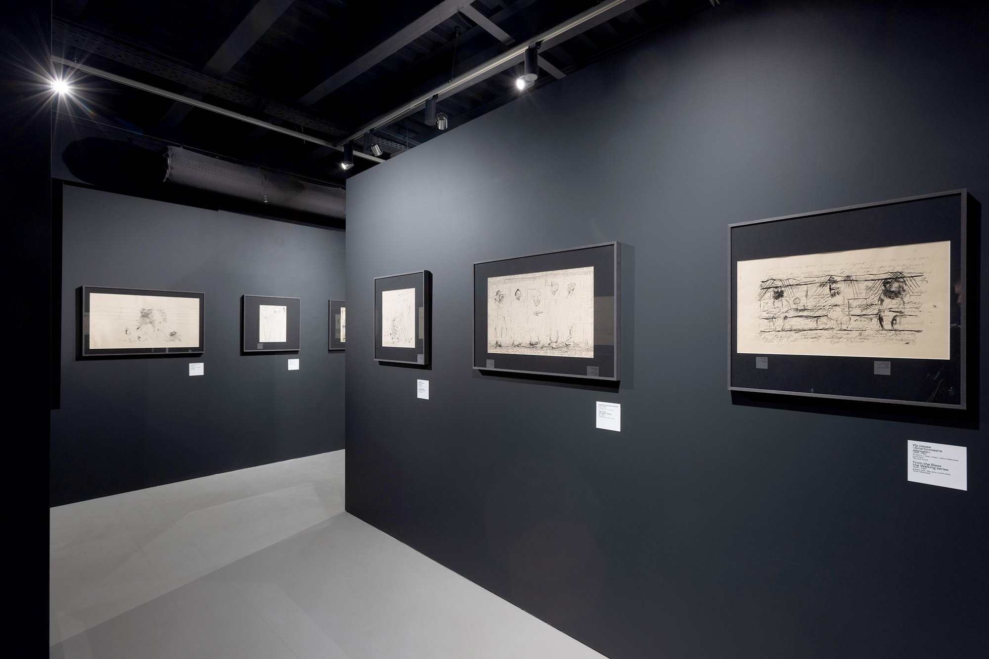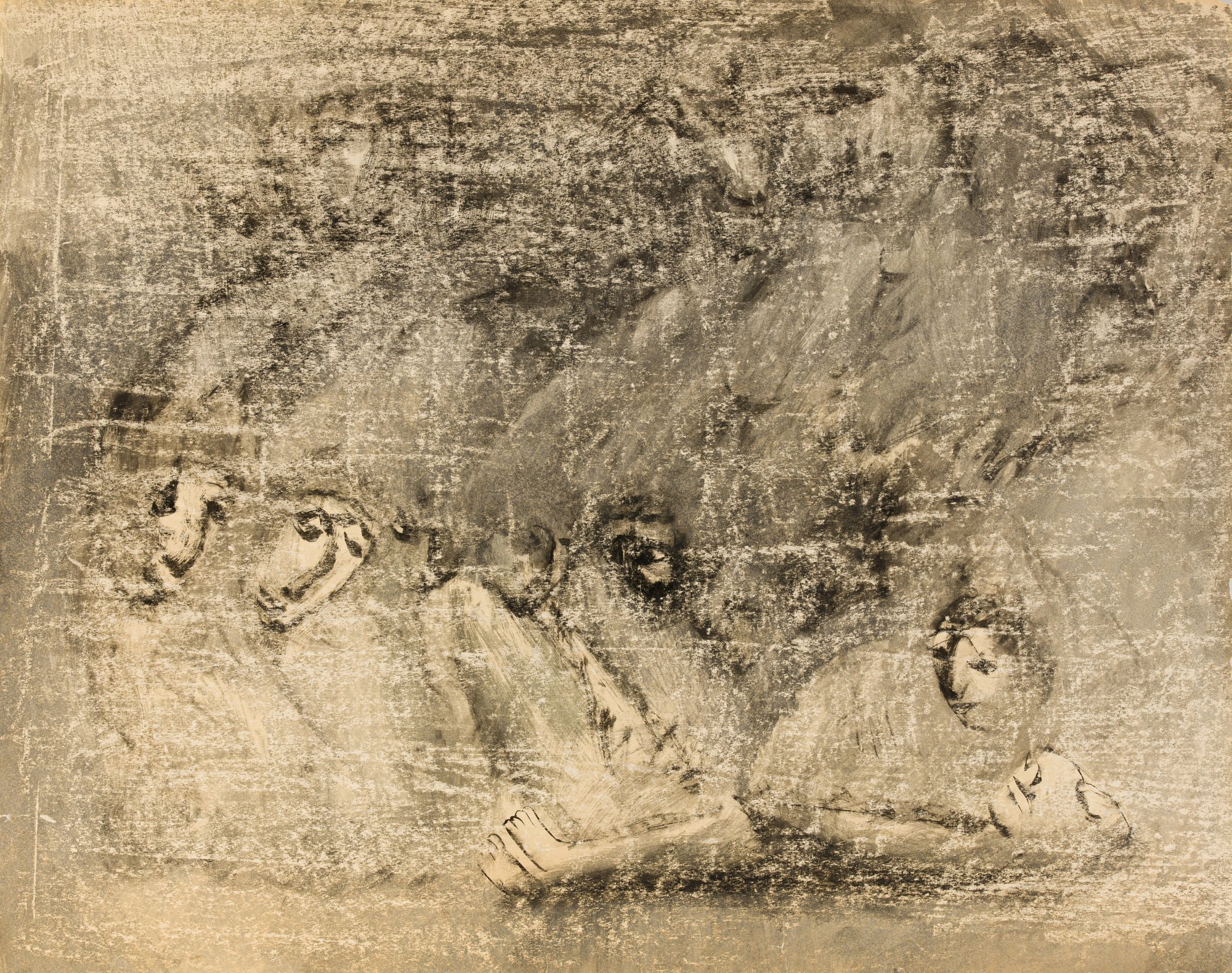 The exhibition ‘Procession’ begins with an introductory “informational” room: gates recalling Auschwitz, and a concise chronology of the “Final Solution to the Jewish Question” from 1933 to 1943, compiled by historian Ilya Altman of Moscow’s Holocaust Centre. From there, the visitor is drawn into an installation-as-passage. Works on paper hang along a narrow, dark corridor-labyrinth devised by Dmitry Baryudin of the Architectural-Artistic Agency Poslezavtra. The works are deliberately heterogeneous – drawn from different series and holdings, including the Pushkin State Museum of Fine Arts, the private Museum AZ and the Museum of Contemporary Art ART4, as well as private archives, among them the artist’s family. The staging makes the viewer, quite literally, a participant: one of the “walkers” within the procession. Lion, too, positioned himself among the survivors of the Catastrophe; after drawing fourteen sheets of “the walkers,” he named himself the fifteenth.