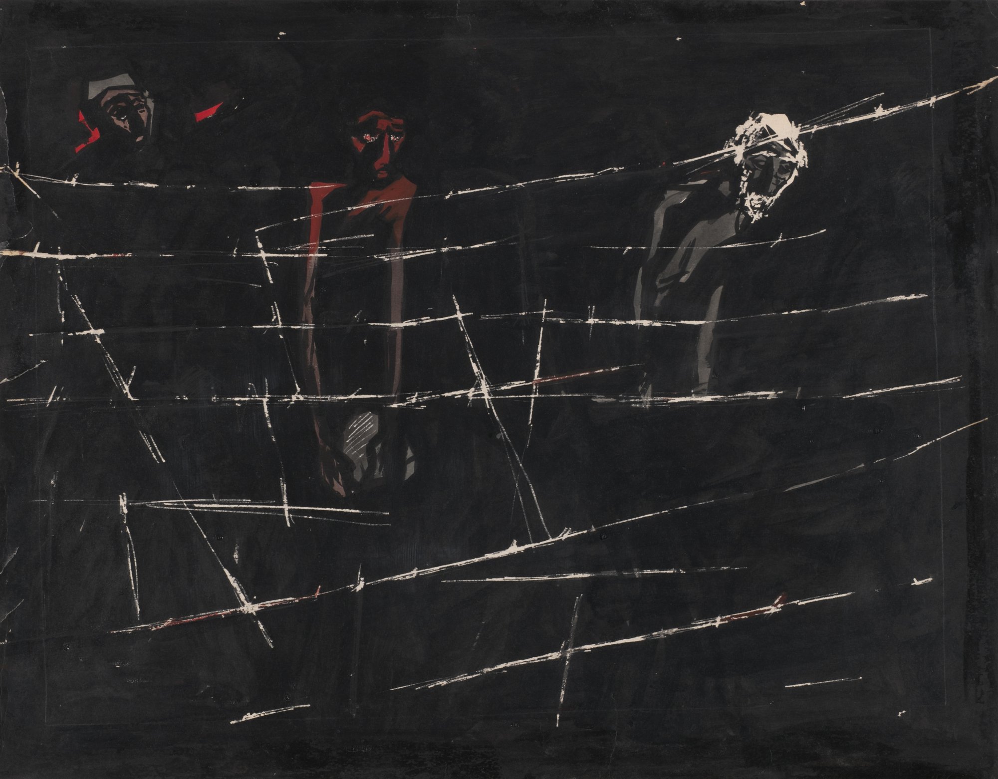Lion was born in Kaluga, some 200 kilometres from Moscow, into a lawyer’s family. After graduating from Moscow Art School No. 1, he entered the graphics department of the Moscow Architectural Institute. A veteran of the Second World War, he spent ten years in the Soviet Far East and, after demobilisation, enrolled at the Moscow Polytechnic Institute in 1953. It was there that his language began to crystallise: the Holocaust as an unwavering subject, and a graphic vocabulary pared down to essentials. Lion himself could not pinpoint when he first learned of the Catastrophe – Soviet official ideology did not, as a rule, distinguish Jews from other wartime victims – yet the fact of it became a private, permanent metric. In Moscow he pinned a sheet above his bed with the number 6,351,000, written in his own hand: the count of Jews murdered by the Nazis.