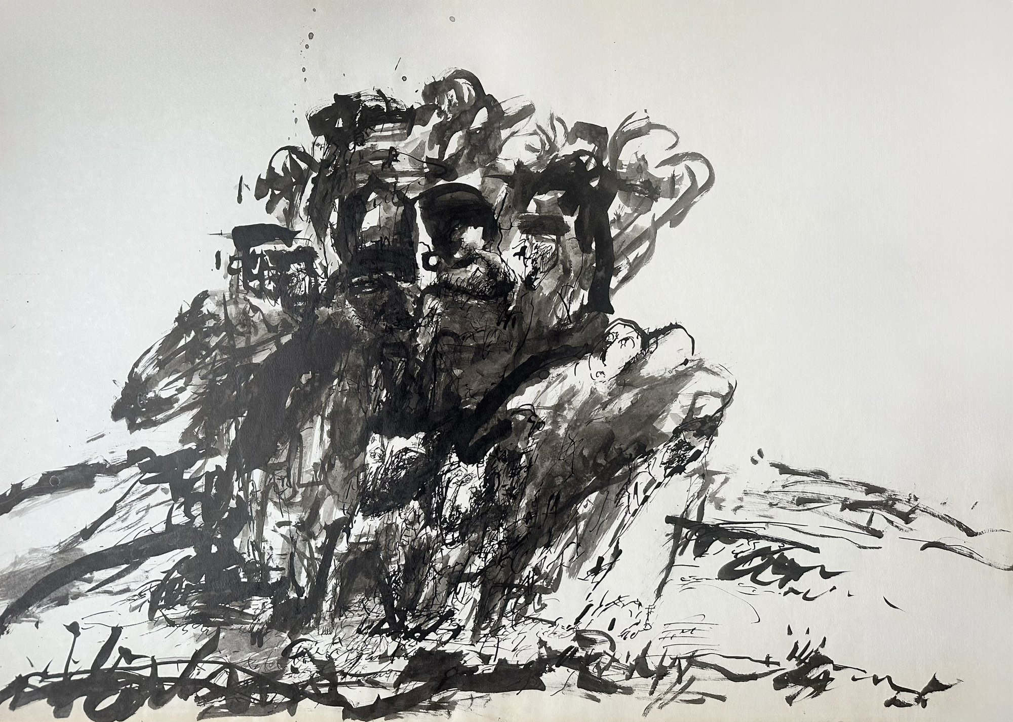 The overarching theme of the Holocaust – the disappearance and scattering of millions of people – is rendered in Dmitri Lion’s graphics with stark literalness. Figures dissolve, melting into constellations of strokes and dots, as if the human body were being erased before our eyes. This effect became the hallmark of Lion’s idiom. He worked at the threshold between figuration and abstraction, between legible mark and expressive flourish, between direct statement and metaphor. He never corrected a sheet – preferring to start anew if something misfired – worked with a reed stick and ink, and never pulled the pen backwards.