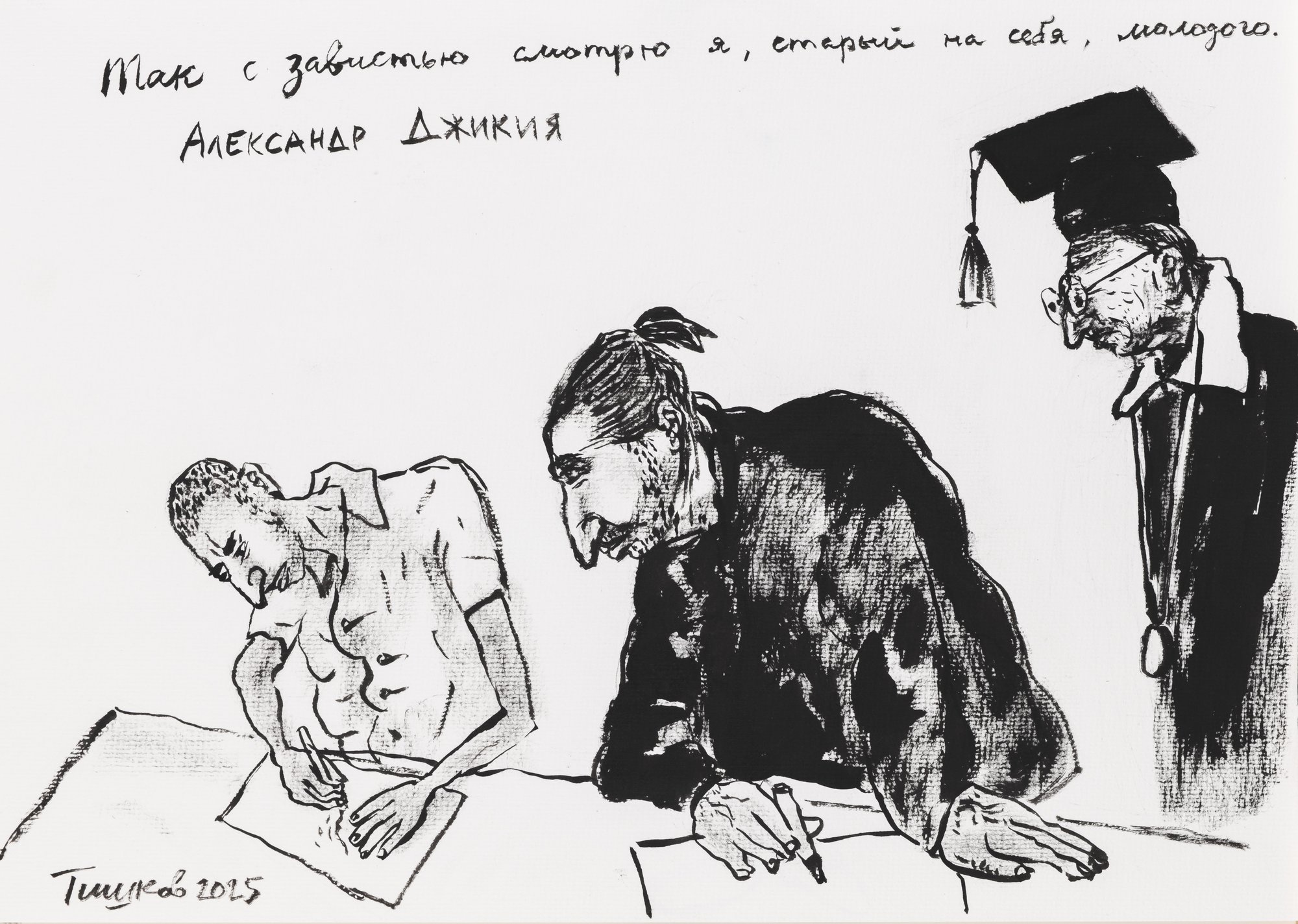 Moscow’s art scene has long treated the artist as a character—part maker, part myth— from the Moscow Conceptualists’ alter egos to today’s post-conceptual portraits. Leonid Tishkov’s witty ZhZKh drawings, first glimpsed on tableware at the bohemian Mukha Club and now expanded at Krokin Gallery, distil those myths into crisp, ironic vignettes. Framed against legacies of the Avant-Garde and Socialist Realism, the show tracks how personas, in-jokes, and “closed” communities keep generating new artist-mythologies for a harsher present.