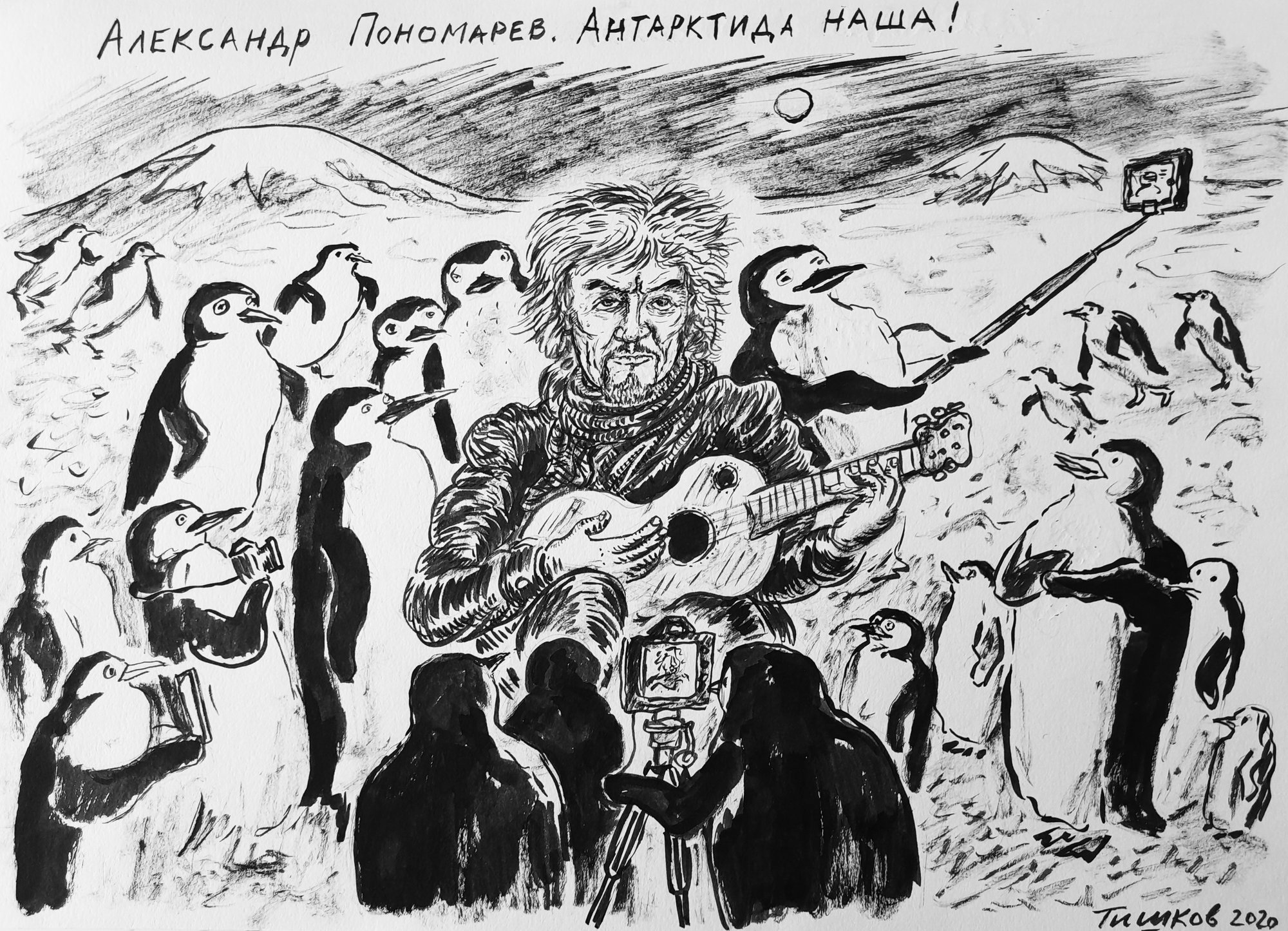 Contemporary art is just as much a source of myths, though these are less widely known. Tishkov’s series of drawings illustrates personal mythologies. Oscar Rabin (1928-2018), a Russian artist who painted gloomy suburban barracks all his life (including the last four decades spent in France), is shown embracing a Russian birch tree against the backdrop of the barracks in his native Lianozovo, in an obvious fit of nostalgia. Alexander Ponomarev (b. 1957), creator of the Antarctic Biennale, plays the guitar to penguins under the slogan ‘Antarctica is ours!’ – echoing the infamous ‘Crimea is ours.’ Alexander Mareev (b. 1969), who loves drawing dozens of insects on a single page, is surrounded by dozens of mosquitoes.