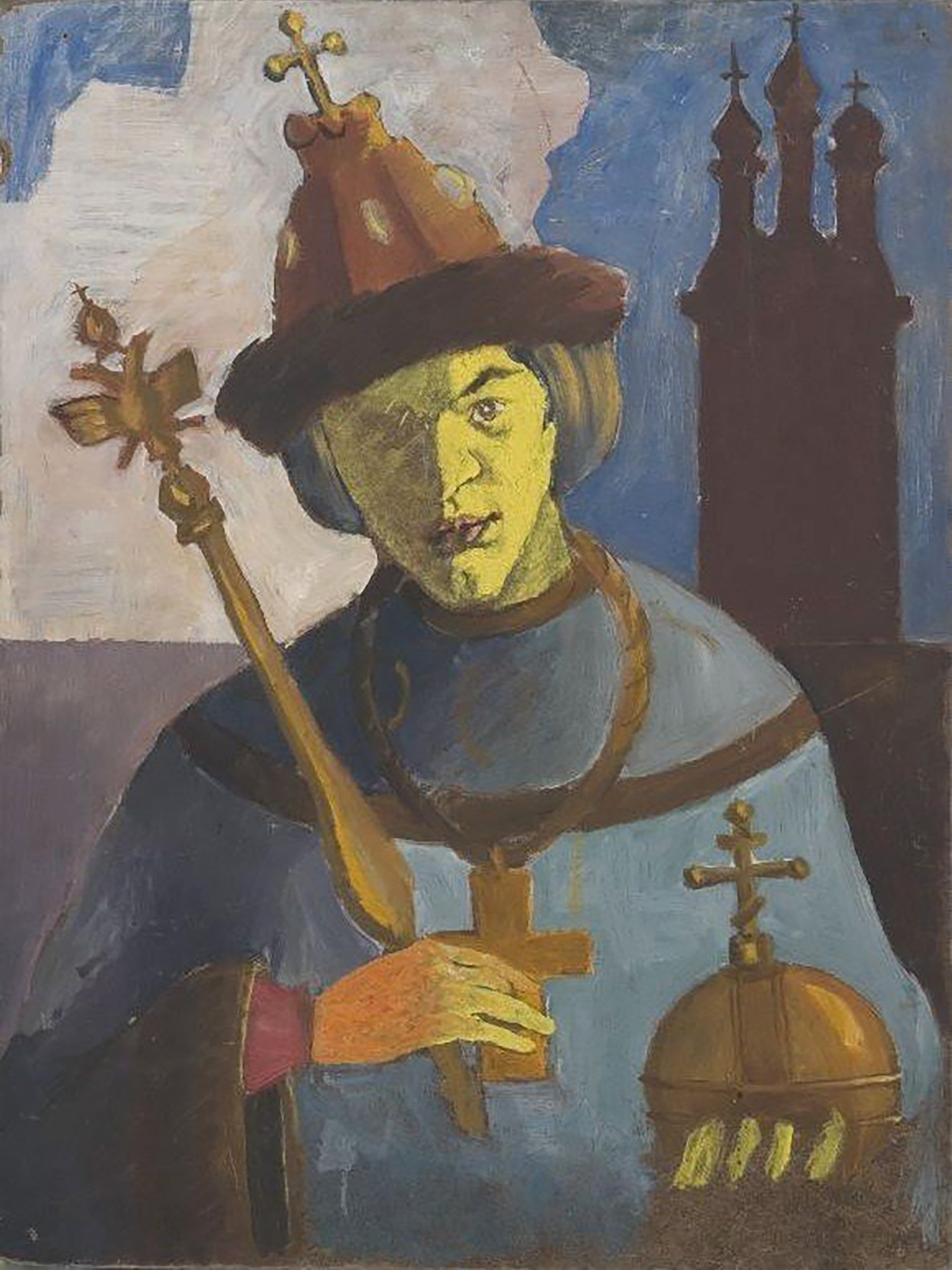 The break from modernism was laid down by the Moscow Formalists in the 1920s, particularly in Yuri Tynianov’s theory of poetic language, along with the term “lyrical hero,” representing the poet’s creation of an alter ego, whose revelation is the core theme of their work. Transferring this idea into the literary Moscow art scene of the 1970s gave rise to a range of characters. Later it evolved into the idea that the art community is a gathering of imaginary personalities. This idea is illustrated by an early series of portraits by Konstantin Zvezdochetov, where he depicted members of the Mukhomor art group as historical characters. Some works in this series were displayed again at the Rosizo gallery in an exhibition ‘Art Behind Closed Doors’, including Sergei Mironenko’s (b. 1959) portrait as a Roman patrician crowned with a golden wreath (1979, from the MANI Museum collection). Zvezdochetov portrayed himself as a Russian tsar – in the Monomakh Hat, holding a sceptre and orb (1979, from the MANI Museum collection).