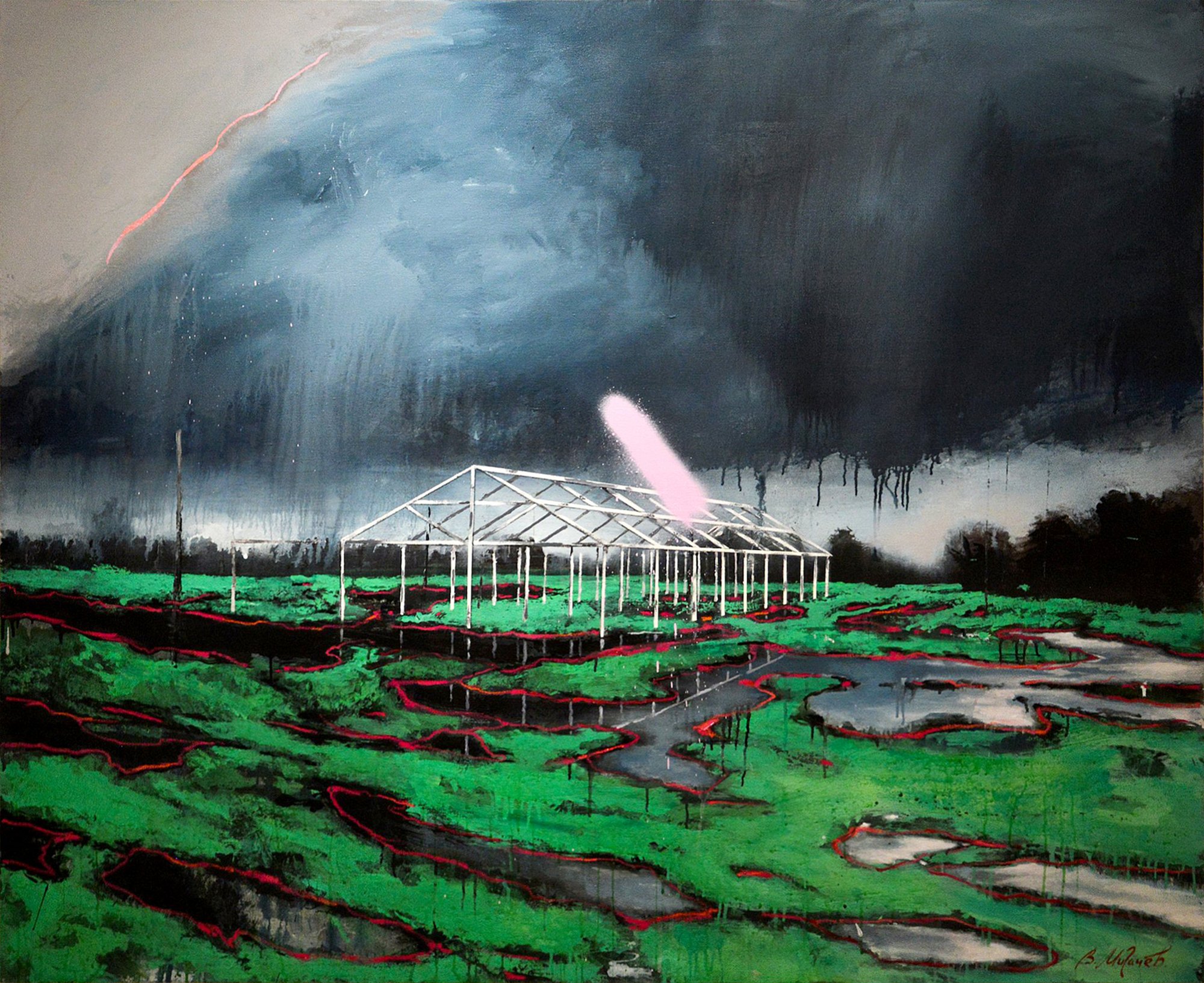 A glitch-like, surreal flickering of alien objects and images disrupts the carefully constructed realism of Timofey Smirnov. A metaphysical light seems to radiate from within the park landscapes of Evgenia Buravleva. The convulsions of space collapsing into a black hole instill dread in the urban visions of Vladimir Migachev. Office workers and kindergarten children suddenly become participants in infernal carnivals in the spirit of Hieronymus Bosch and Pieter Bruegel the Elder in the paintings of Masha Safronova.
