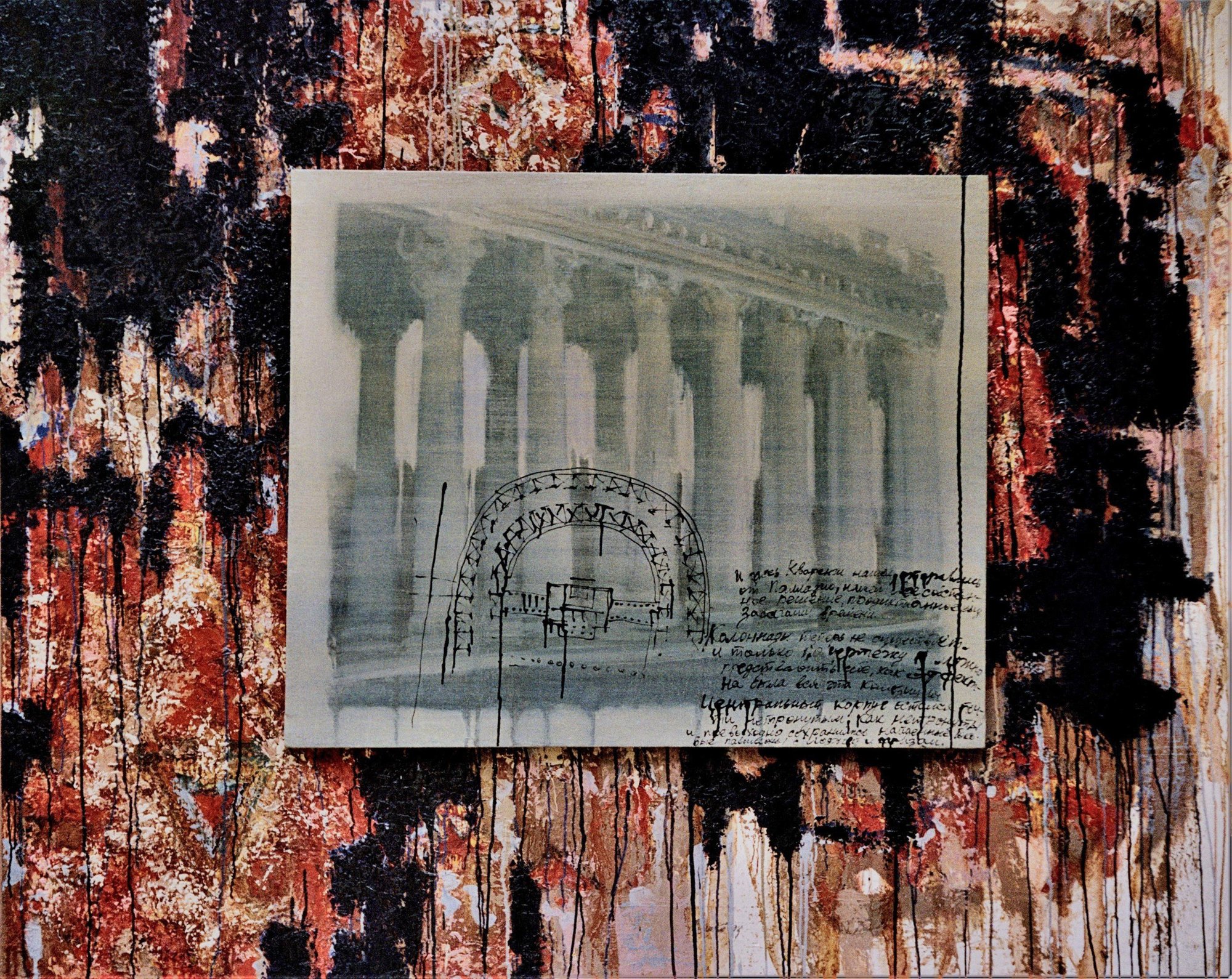 The current exhibition features later works by members of the ‘Art or Death’ group. Shabelnikov, who continued to provoke the public long after his move to Moscow, is perhaps best remembered for the 1998 performance ‘Mausoleum: Ritual Model.’ In collaboration with Yury Fesenko (b. 1955), Shabelnikov famously consumed a cake fashioned after the body of Vladimir Lenin. While an attentive viewer can uncover this history via a QR code, the exhibition itself maintains a decorous veneer; the dense hanging and traditional presentation effectively neutralize the subversive potential of the works. Here, Shabelnikov is represented by paintings from his ‘Requiem of Will’ (2005) and ‘Esoteric Football’ (2007) series, which dissect ideological iconography. Fesenko’s contributions include ‘Ruin. Carpet. Structure’ (1995) and two new “holey” canvases titled ‘Losses’ (2025). Featuring red and white Scythian horsemen, these works reflect on transience and the nature of physical and cultural ruptures. Similarly, Koshlyakov’s signature style is present in his depictions of imperial ruins painted on dilapidated cardboard.