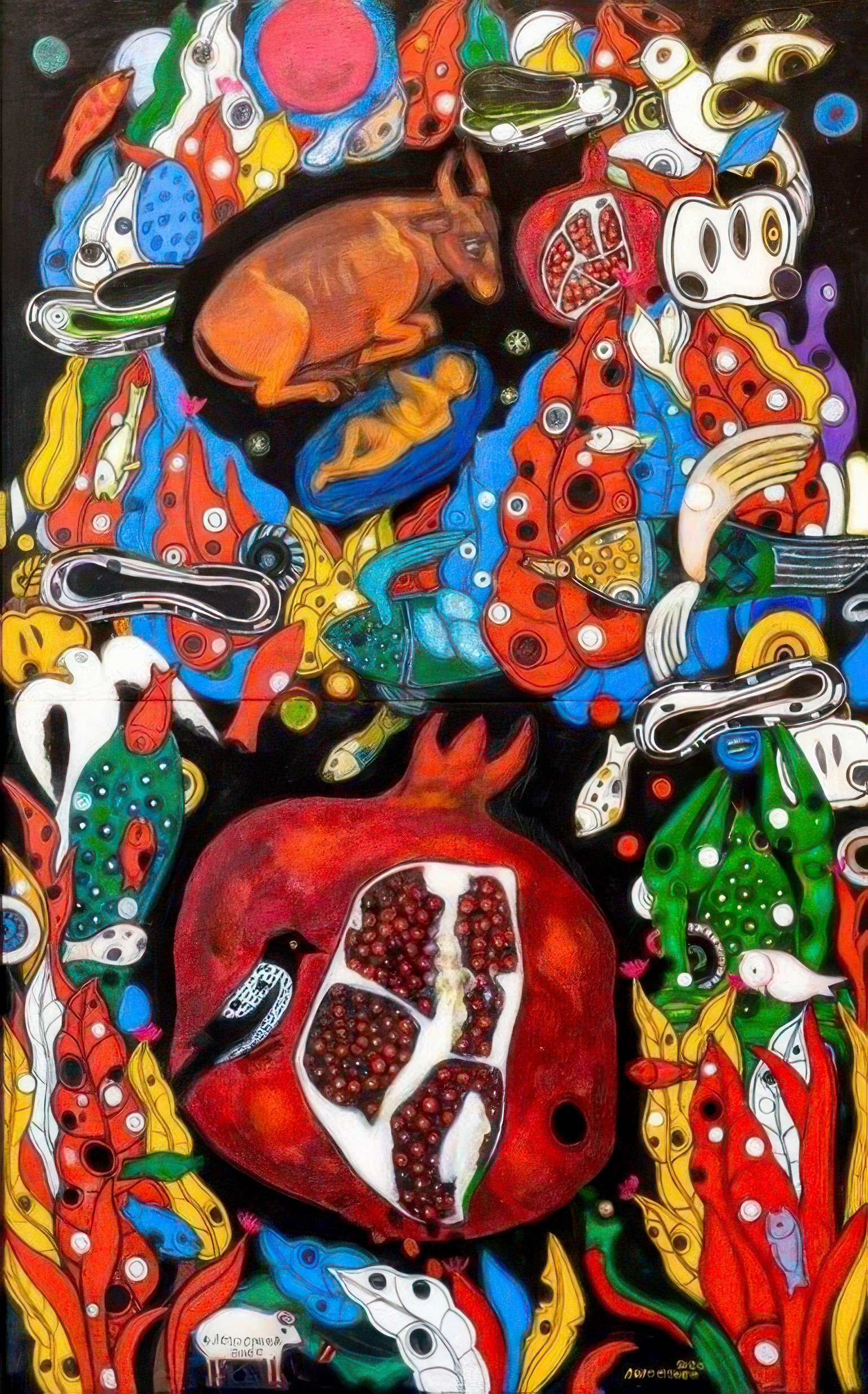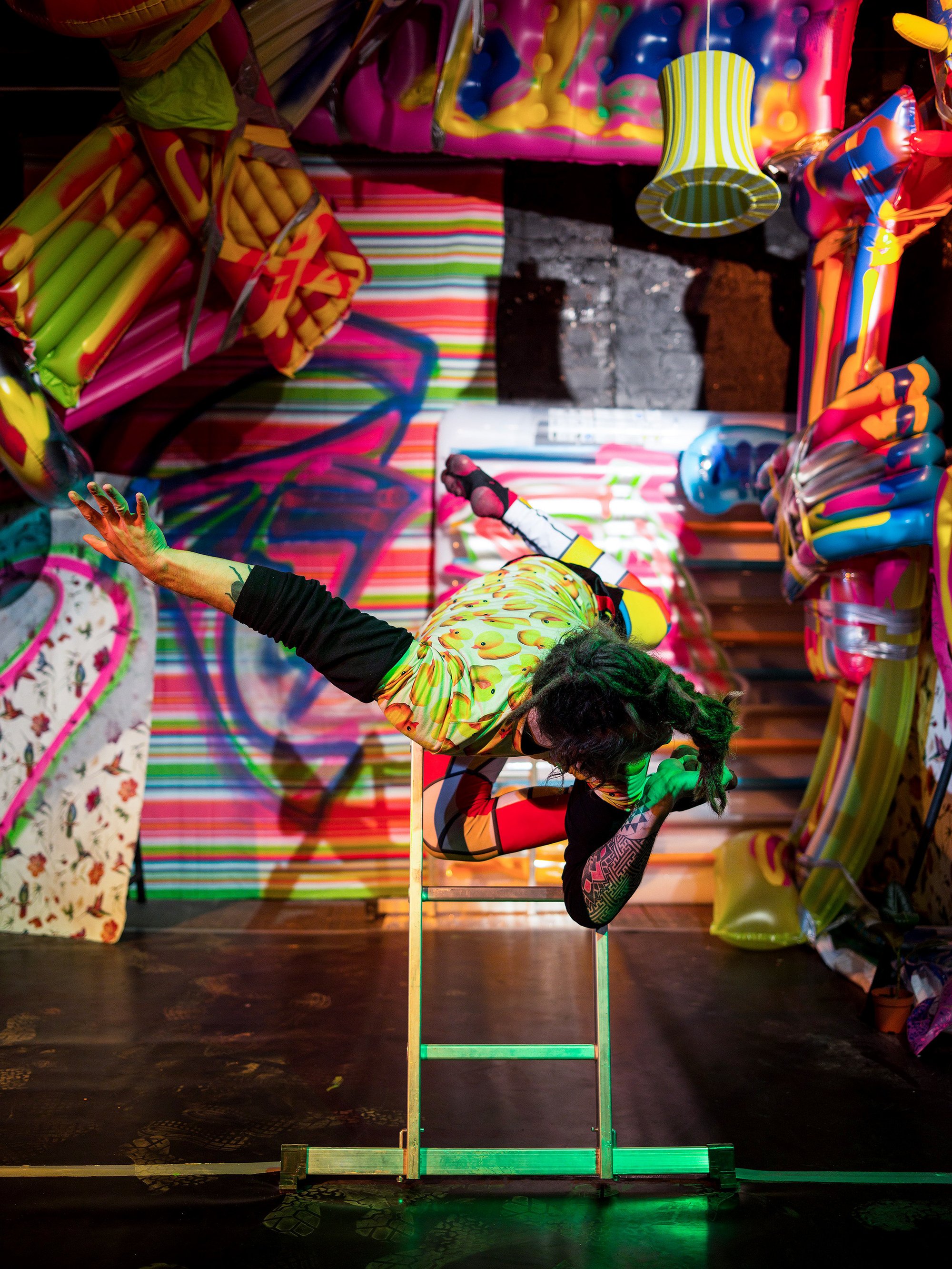 Sergei Shekhovtsov (b. 1969), another prominent artist, joined the former ‘Art or Death’ circle later while living in Moscow’s squats. The Fabergé Museum currently features a sculpture made from his signature ‘poor’ material: foam rubber. Suspended from the ceiling, ‘The Gardener’ (2005) – part of the Tsvetaevo series – appears to spray toxic fertilizer over the neon-bright canvases and assemblages in the final hall. This “miracle solution” feels as though it were mixed by the curator: it acts as a pesticide, neutralizing the more reckless histories of the Rostov artists by omission, while simultaneously saturating the ‘Open World’ with an unearthly, acidic glow. This tension culminates in the decorative, high-contrast photography of Sergei Sapozhnikov (b. 1984), whose dynamic ‘Dance’ (2017) serves as the exhibition’s final, quintessential chord.