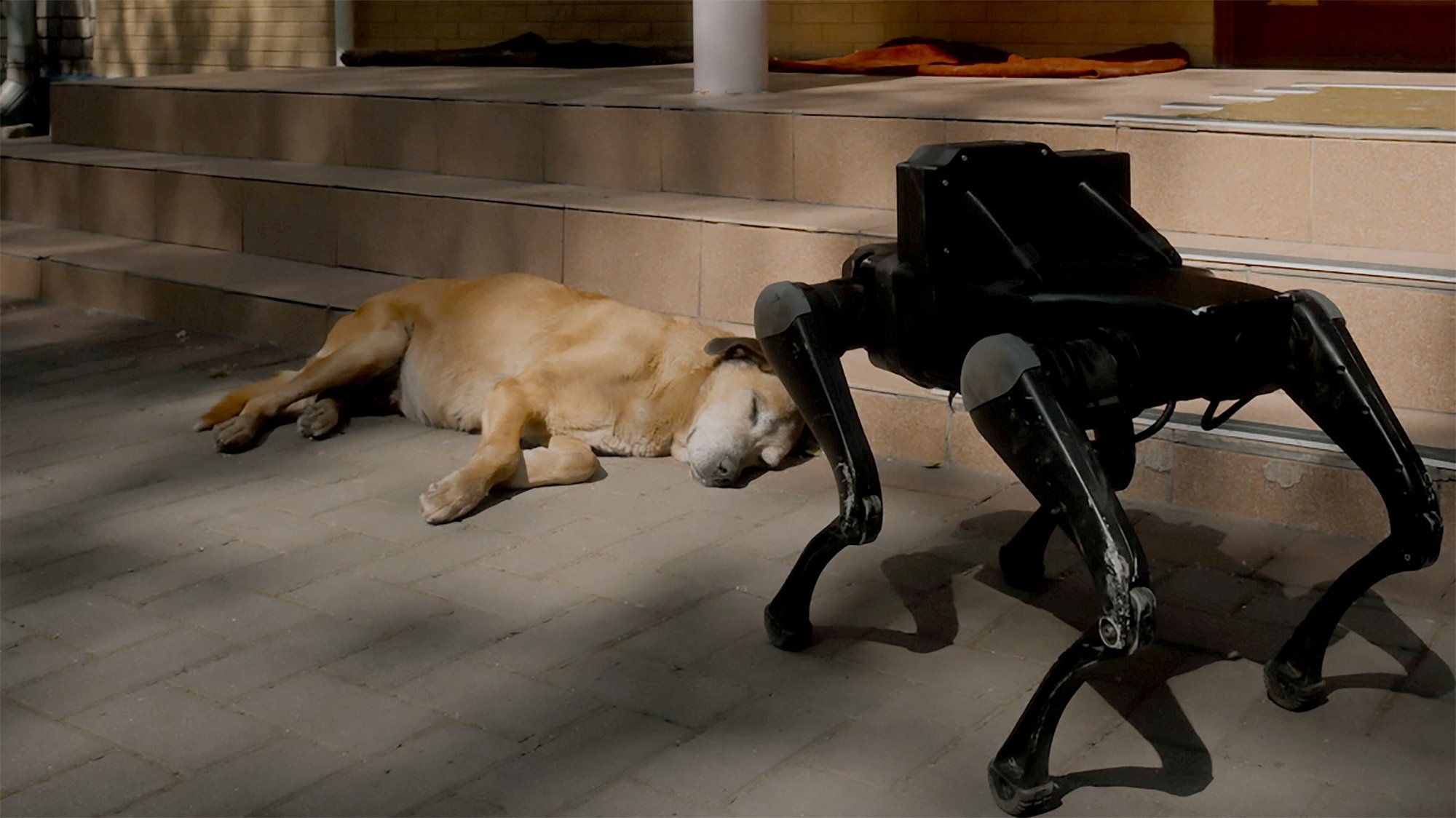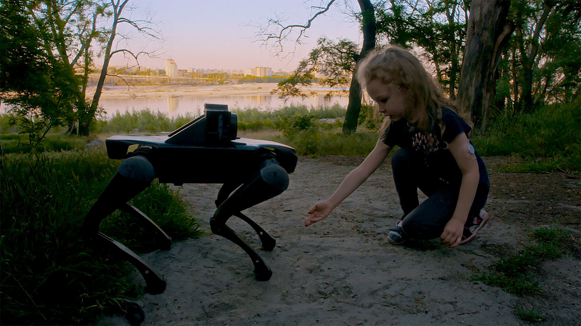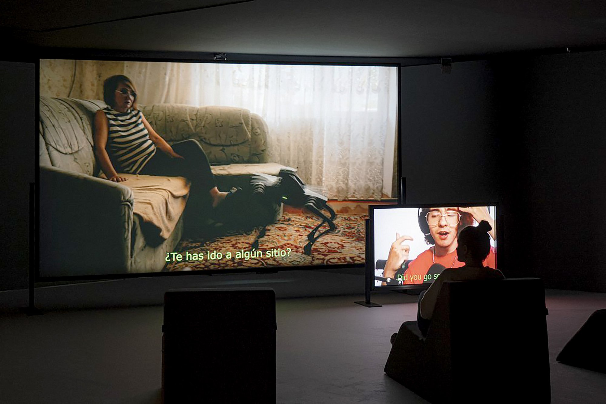 The most emotionally resonant work in the Thyssen exhibition is a two-channel video installation ‘Open World’, made last year in 2025. Here, a seventeen-year-old Ukrainian boy, displaced from his home in Kiyv four years ago, reconnects with his home environment through a robotic canine avatar. On a smaller screen, we see him controlling the device and speaking through it. Moments of humour – such as calling out to his cat, who fails to recognise him – are tinged with quiet sadness; as he chats with his mother the emotions between the two are deeply touching. The interplay between distance, technology, and longing is difficult to watch without emotional impact.