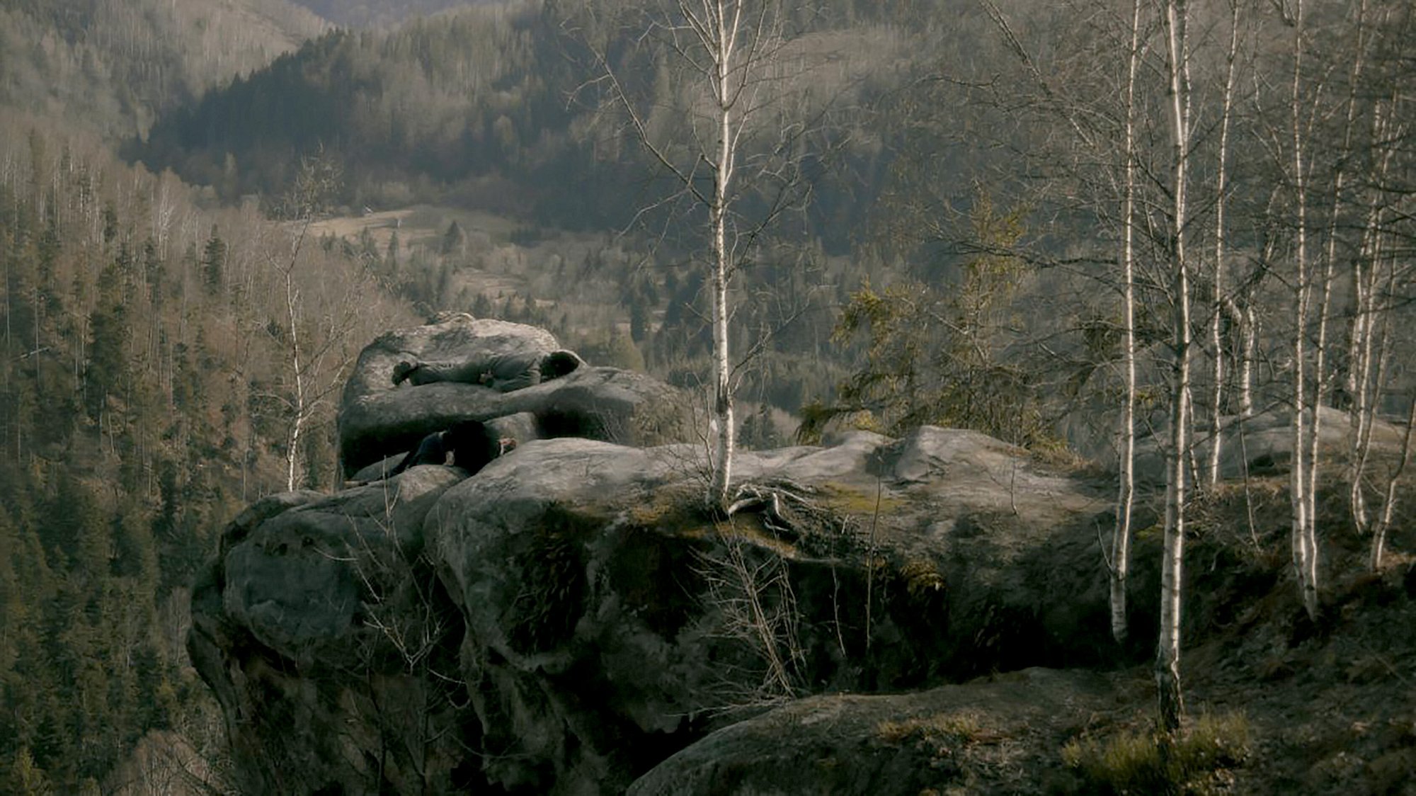 Perhaps the most art historically nuanced work is ‘Wanderer’ (2022), which references German painter Caspar David Friedrich’s iconic ‘Wanderer Above the Sea of Fog’ (1817). The artists film themselves in the Carpathian Mountains, adopting the poses of fallen Russian soldiers. Their faces are obscured; their bodies lie in uneasy, ambiguous positions. The landscape, rendered with a nostalgic, almost cinematic quality, appears at once idealised and unsettled.