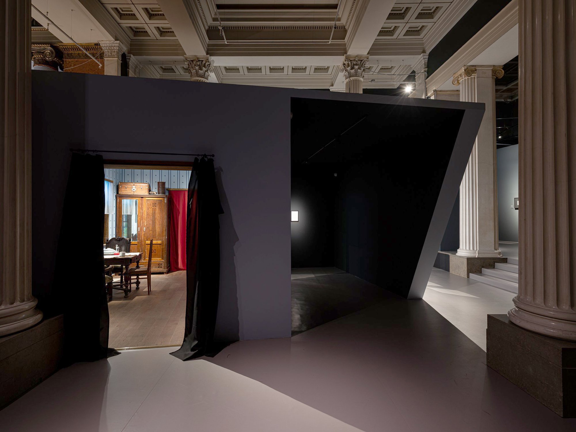 Often, even when artworks are moved to a different room within the same museum, they change in appearance to the viewer. Here the paintings feel very cramped, though they were originally created for a very small theatre space.