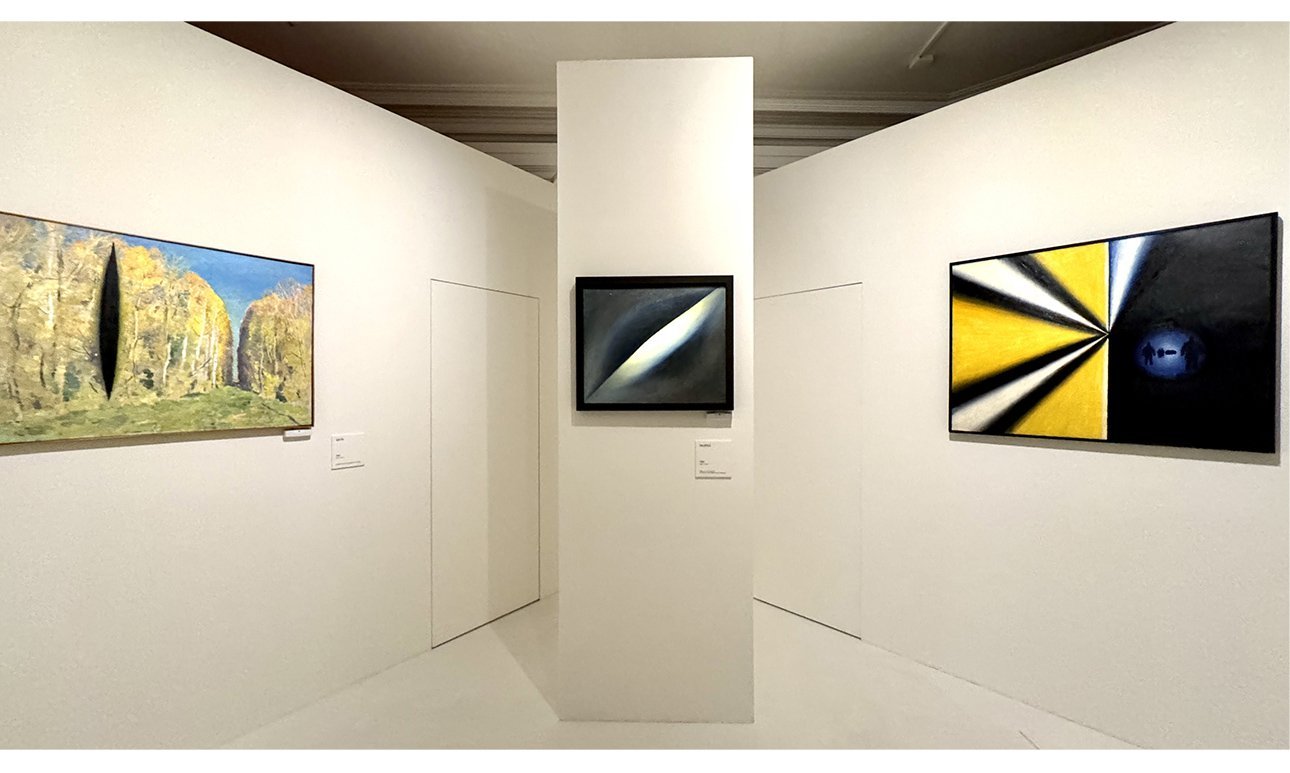 The exhibition opens with early works from the 1960s, in which the pictorial plane is interrupted by a streak of colour. Sketches in coloured pencil anticipate the creation of a large canvas on the same theme, displayed at the end of the enfilade. These “coloured cuts” of 1964 evoke several strands of post-war modernism: first, Abstract Expressionism; and second, Spatialism, associated above all with the Italian artist Lucio Fontana (1899-1968). Like the radical innovators of the post-war generation, Bulatov breaks with the traditional conventions of pictorial illusion. He opens a gaping wound in the surface of the image, staging a conflict between two states of painting: painting as object and painting as space. Space cuts through the material skin of the image, drawing the eye into black slits from which darkness seems to seep.