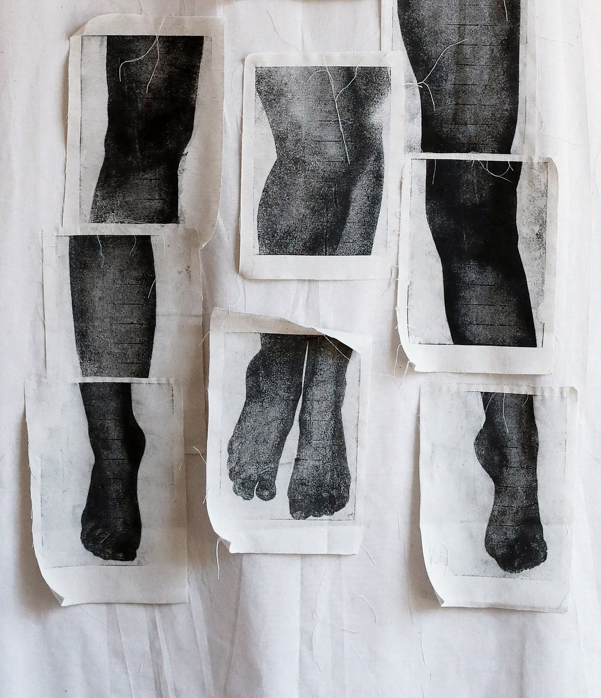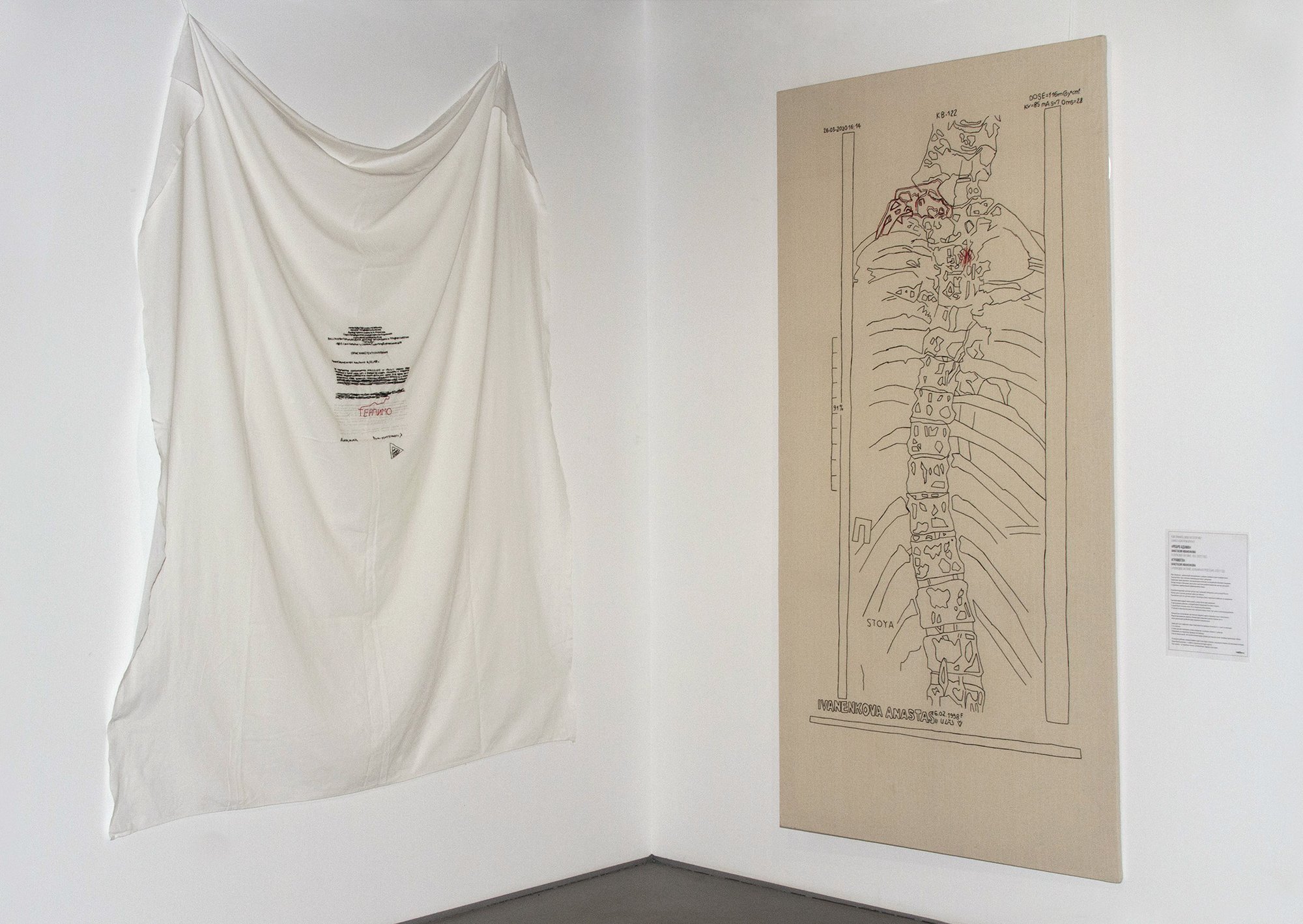 Deconstruction is precisely Lidiya Baranik’s (b. 1983) method in ‘Drift Within’. She created a collage from photographs of her own body, printed it using paper lithography, and assembled it into an appliqué on a vast canvas that has undoubtedly become one of the exhibition’s semantic centres. The resulting image conveys several poses of the photographed heroine at once. Yet because the fragments on the canvas exist separately, any movement of air makes them drift while remaining in place. Another powerful visual accent is Anastasia Ivanenkova’s (b. 1998) hospital diptych. Onto bedsheets are embroidered both a radiologist’s report and the X-ray image to which it refers. This is the story of the artist herself. The work is ironic and therapeutic, but also, of course, deeply marked by pain.