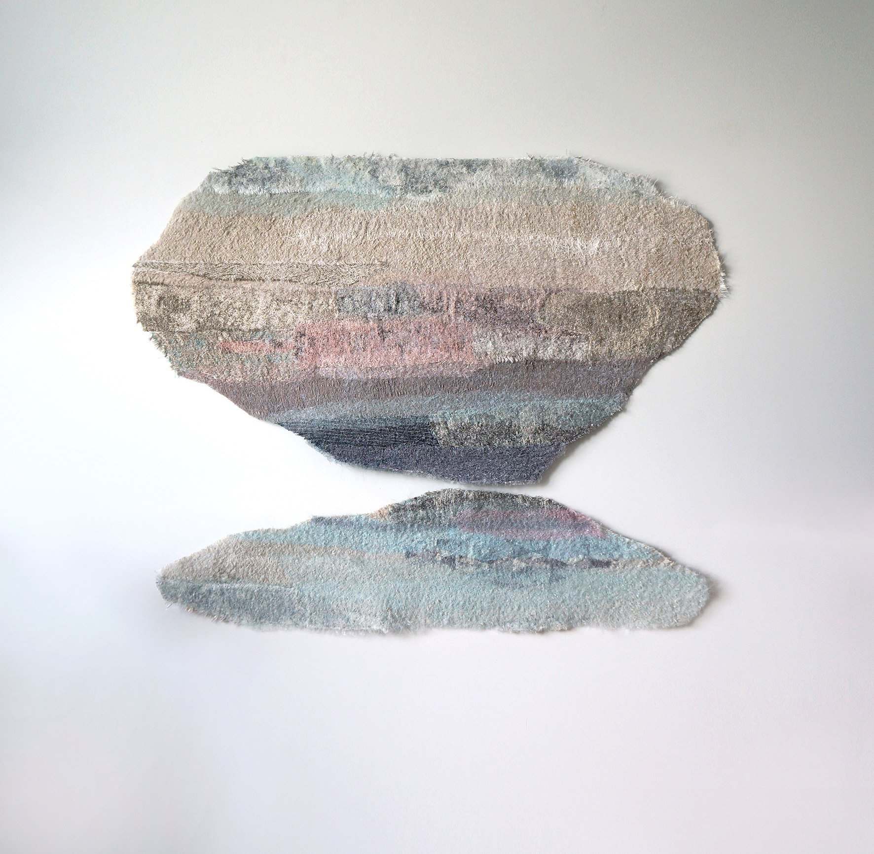 Here we see the path of glacier A23a, neatly embroidered by Liza Perelman; Natasha Kosovets’s (b. 1976) mountain-clouds suspended in weightlessness; Irina Kliuchnikova’s emotional reliefs; and the life-affirming routes of cellular movement in Katarina Ivanović’s ‘Connection’. These strikingly different narratives respond with precision to the exhibition’s central theme. The body of a glacier is no less corporeal than what a person sees in the reflection of a panic attack; the body can be heavy, or weightless; the body can even be deconstructed.