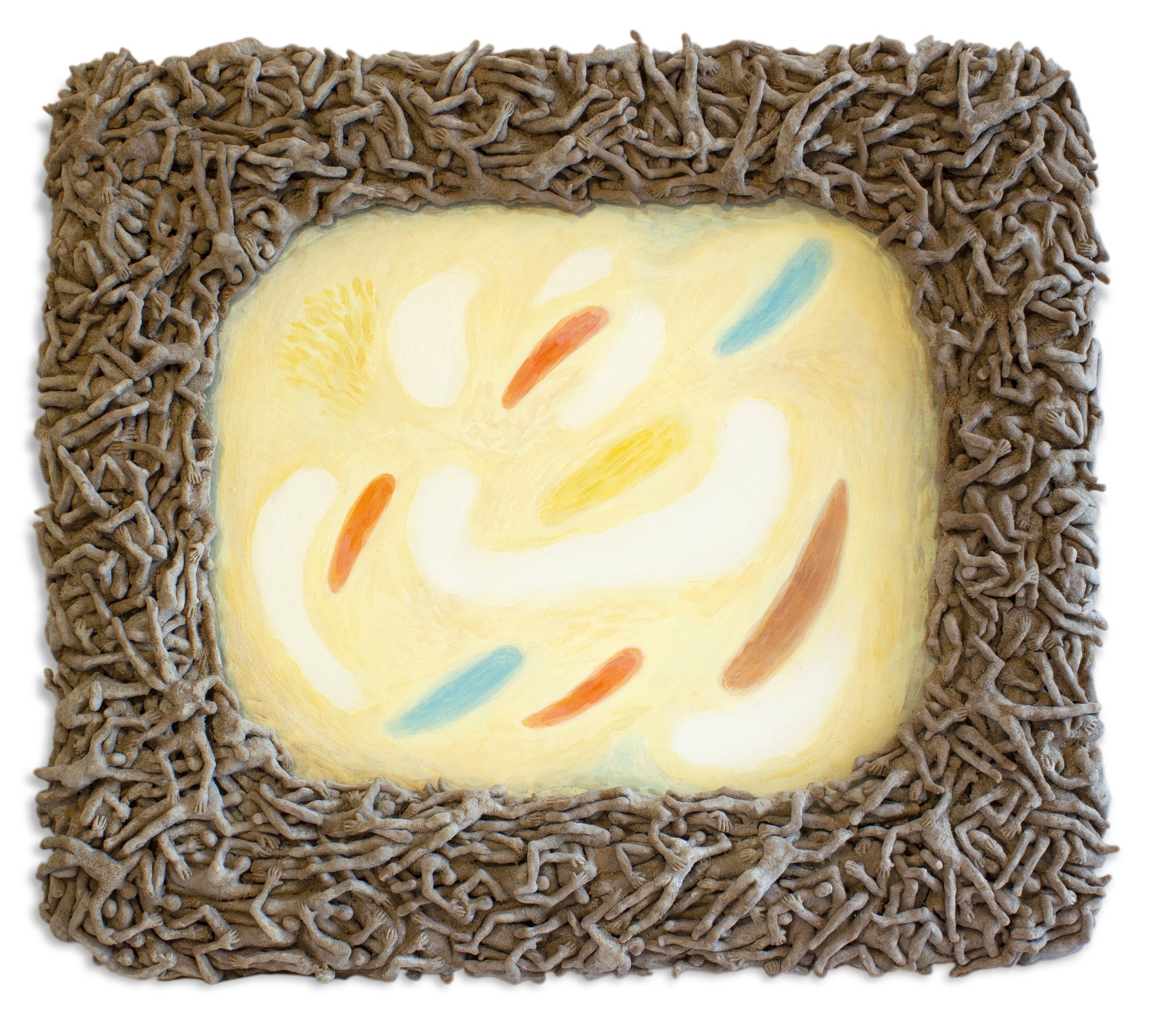 Since 2008, Kuzkin has been creating sculptures from bread pulp. For him, bread is a multi-layered symbol of raw and suffering human flesh, rich with different connotations — from the concept of transubstantiation in Christian liturgy to the tradition of making bread figurines in Russian prisons. The sculptures have varied in size, ranging from the three-metre-tall ‘Heroes of Levitation’ to the hundreds of small figurines that make up his award-winning ‘Prayers and Heroes’ installation, which was exhibited at the Moscow Biennale and the Garage Triennale. Eventually, he grew tired of this medium and planned to say goodbye to it after a major exhibition of bread artworks, scheduled for autumn 2022 at the State Tretyakov Gallery. However, along with many other cultural initiatives, it was cancelled after the start of Russia’s armed conflict with Ukraine. In exile, Kuzkin continued to work with bread, and the second part of the exhibition shows how his relationship with his signature medium has evolved during this period. He started combining it with painting, and this unlikely union proved successful, as demonstrated by two artworks facing each other. The first, titled ‘Deliverance’, is a brightly coloured abstract painting in a heavy frame formed of tiny human figures that appear to be writhing in agony. Made out of salty bread pulp, they surround the canvas like an eerie, Dante-esque whirlwind of sinners. The second, titled ‘Art – Life in Paradise’, features a sculpted human face and two hands emerging from the surface of a semi-abstract jungle scene. This character, the artist’s alter ego, looks at the world beyond the canvas with quiet bewilderment, ready to dive back into the painted thicket. The theme of escape resurfaces here – quite literally. “These artworks are transitional,” Kuzkin told me when I asked if they marked the beginning of a new series. For him, they are a transition between his signature bread sculptures and whatever will come next –he seemed unsure as to exactly what that would be.