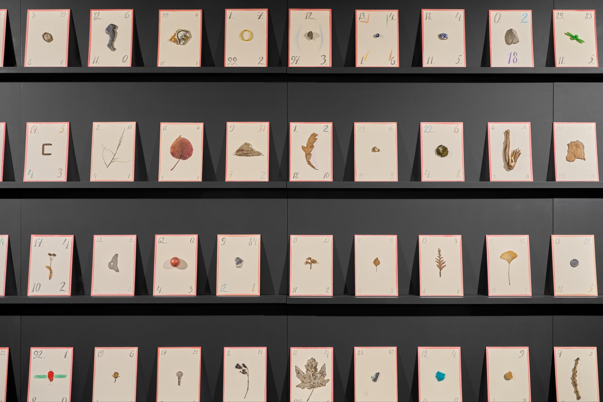 The first part of the exhibition shows the evolution of projects that Kuzkin started long before his exile, when they were transplanted, sometimes quite literally, into Western European soil. The ‘Cards’ series originates from a performance called ‘1 4 12 3 18 9 16 1 – 15 8 99 3’, in which the artist asked other people to give him random small objects found in their pockets or handbags. He then glued these objects onto sheets of cardboard, wrote numbers in the corners, and gave the artworks back to the people who had given him the objects. These numbers held personal significance for Kuzkin; he had developed a secret numeric language that only he could understand. In France, the performance evolved into a kind of solitary meditation: no one else was involved, and the artist used objects he found in the streets of Paris, such as leaves, flowers, small toys, and lost keys.
