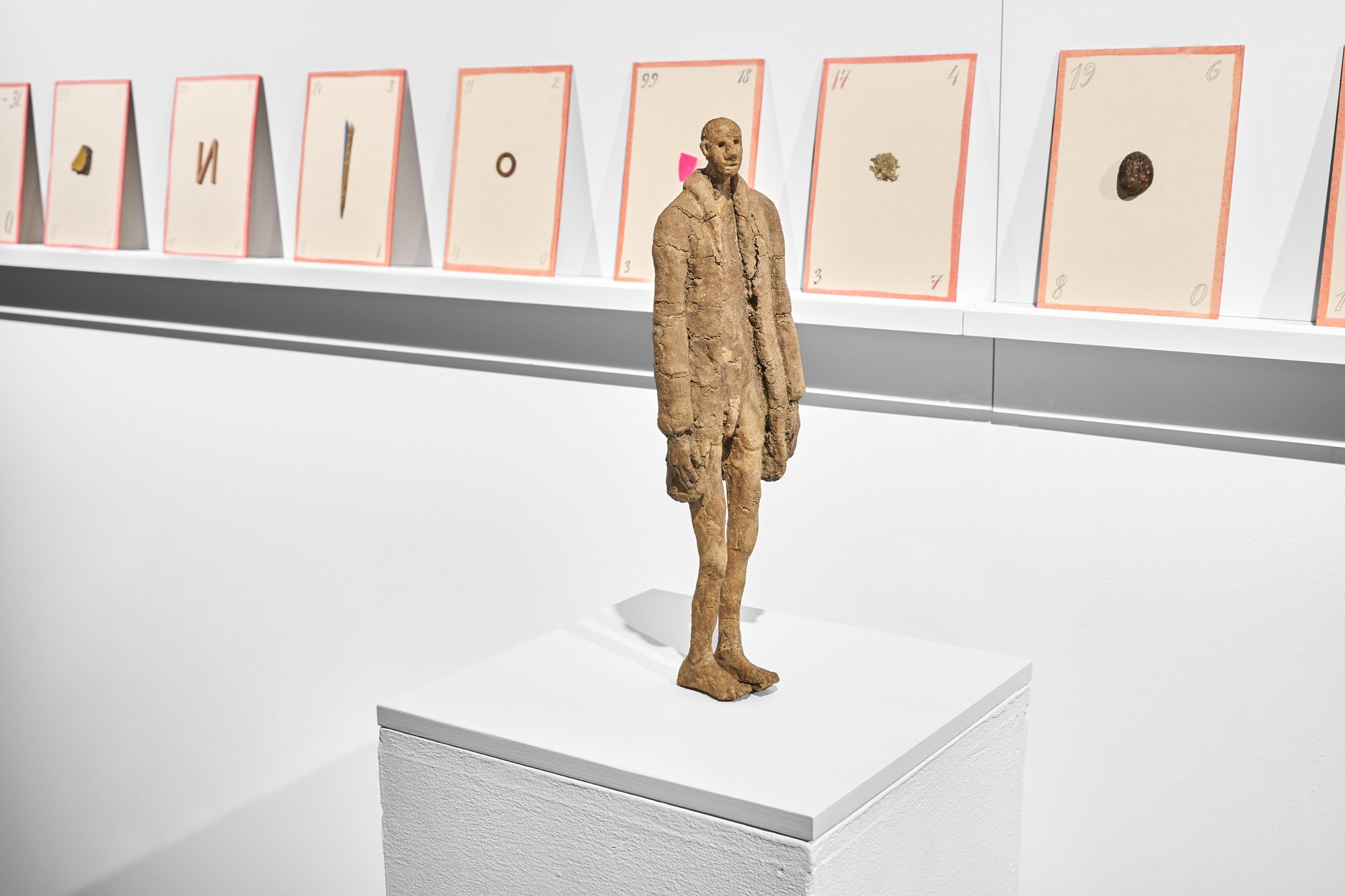 These laconic pieces are placed along narrow shelves on the walls, while a textile curtain with a photographic print divides the long, narrow hallway into two. The photo on the curtain depicts a man standing on his head with his arms and legs in the air, his face buried in the ground on a hill above an idyllic European town. The man is Kuzkin himself, and his pose will be familiar to his fans in Russia. Conceived as an homage to his late father, the artist Alexander Kuzkin (1933–1983), it is based on his eponymous lithograph depicting an actual tree 99 times. Andrei Kuzkin poses in various locations, pretending to turn into a tree and become one with nature, even if only for a short time. “The idea here is escapism and retreating into some kind of parallel world,” says the artist about this part of the exhibition. “That is, the desire to become a plant or retreat into a semi-insane world of numbers.” The only thing that keeps him grounded in this section, he says, is the artwork that depicts a suffering human body, called ‘A Bread Boy in an Earthen Coat’.
