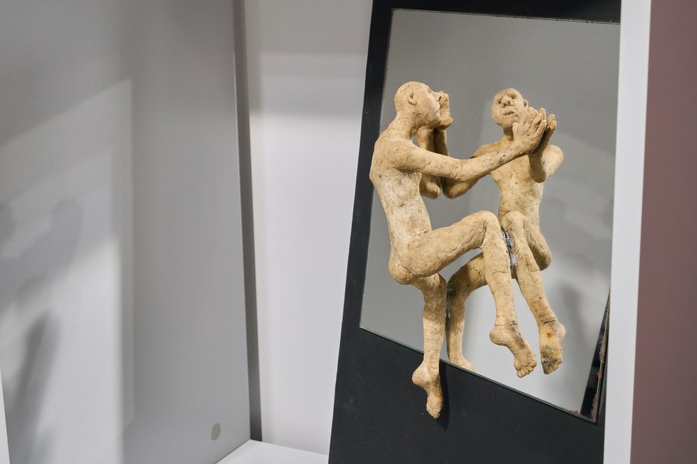Kuzkin’s art has always been philosophical, grappling with the fundamental existential questions of the human condition: the body, suffering, and mortality. He has always been fascinated by the dichotomy of mortal human flesh being a ‘prison for the soul’, and the spirit confined within it. Even in exile, he remained true to himself. His artworks became smaller in scale as he had no studio in which to create large sculptures in Paris, and they became more introspective as his social circle shrank in an unfamiliar city abroad. They are displayed in the small, intimate space of the pop/off/art gallery in the centre of Moscow. Narrow and windowless with a vaulted brick ceiling, the space resembles a dungeon corridor. Curated by the artist himself, ‘Not Here’ seems to capture the current trend in Moscow for semi-underground, self-organised exhibitions in apartments, artists’ studios, and other unlikely places
