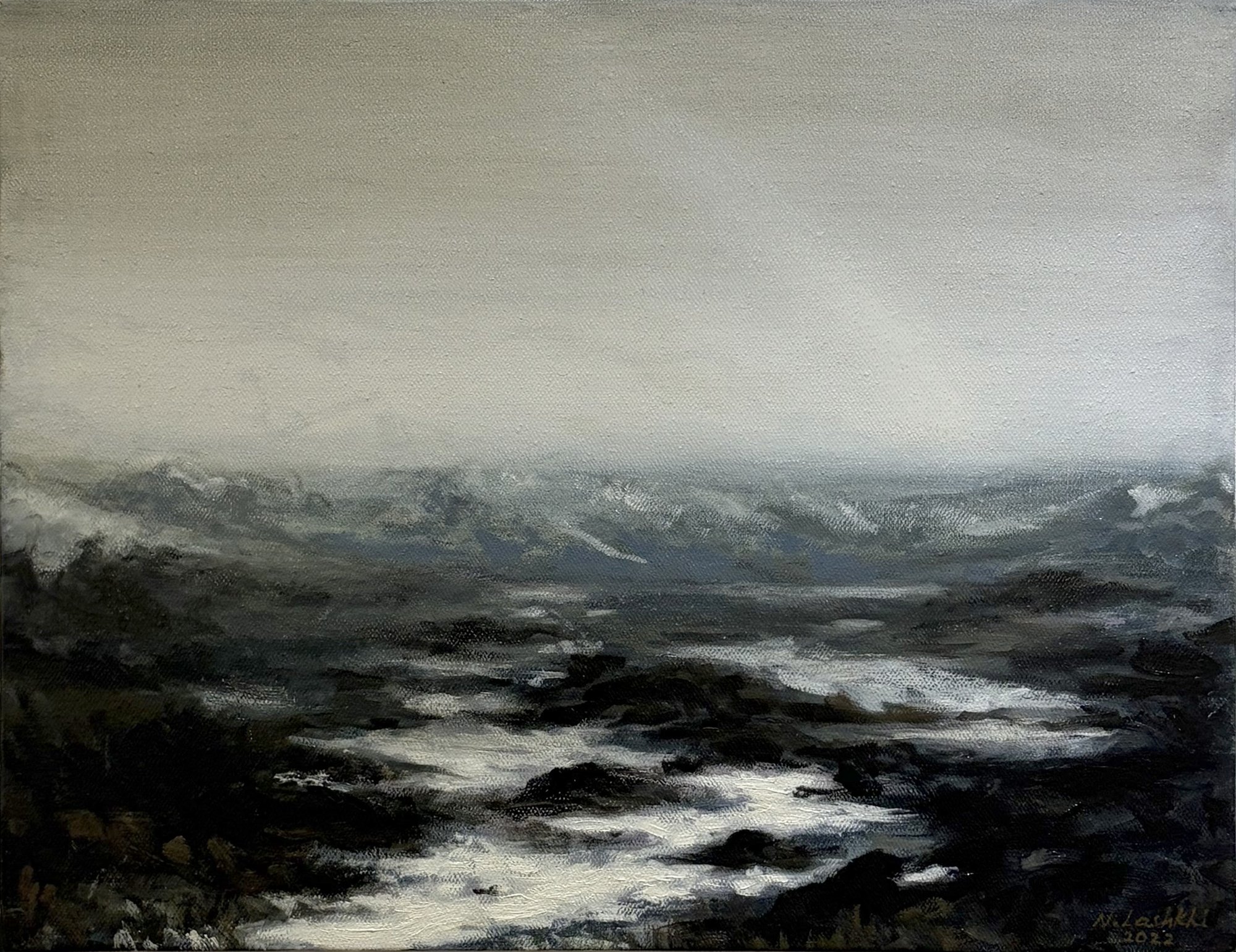 Upon entering the main hall of the Zurab Tsereteli Museum of Modern Art, the viewer is met with a sequence of landscapes: mountain ranges, seascapes, modest village houses and solitary lighthouses. At first glance, these scenes evoke a familiar Georgian topography, yet, they are far from mere representations of place. Instead, they function as emotional cartographies, mirroring the artist’s inner states – restless, isolated, and quietly turbulent. Executed predominantly in a restrained palette of greys and blues, punctuated by occasional bursts of color, these works oscillate between external meteorological unease (wind, rain, overcast skies) and an internal atmosphere of anxiety.