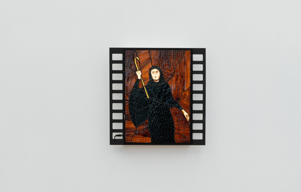 Several works are presented within illuminated frames, subtly alluding to the cinematic origins of Parajanov’s project. Three pieces function almost as a suspended film still. Notably, alongside direct representation of Shushanik in many instances Apakidze turned to symbolic motifs that evoke her faith, suffering, and resistance. In one particularly striking composition, the artist introduces a contemporary intervention: the head of the nun is threatened with a firearm. The visual language is pared down, almost austere, yet its impact is immediate and profound, collapsing historical and modern forms of violence into a single image.