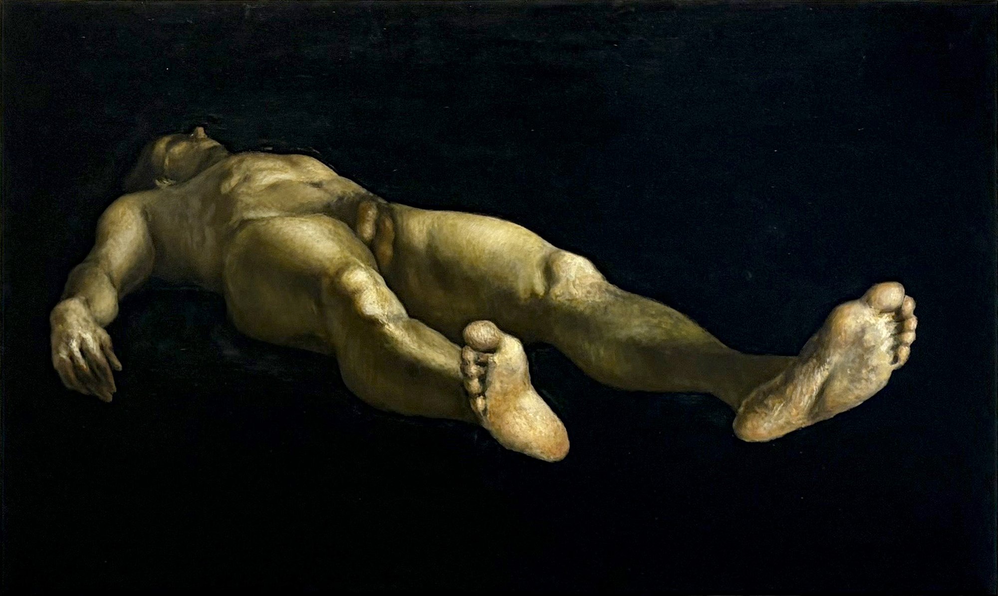 The next series in the exhibition introduces the human figure. Nude bodies are stretched across impenetrable black grounds. Isolated, save for a single paired composition, these figures appear utterly depleted, their corporeality marked by exhaustion and emotional erosion. They embody a contemporary condition: the pervasive burnout that defines Gen Z and Millennial generations. Though not explicitly didactic, the works resonate with broader socio-psychological realities, where fatigue becomes both a personal and collective experience.