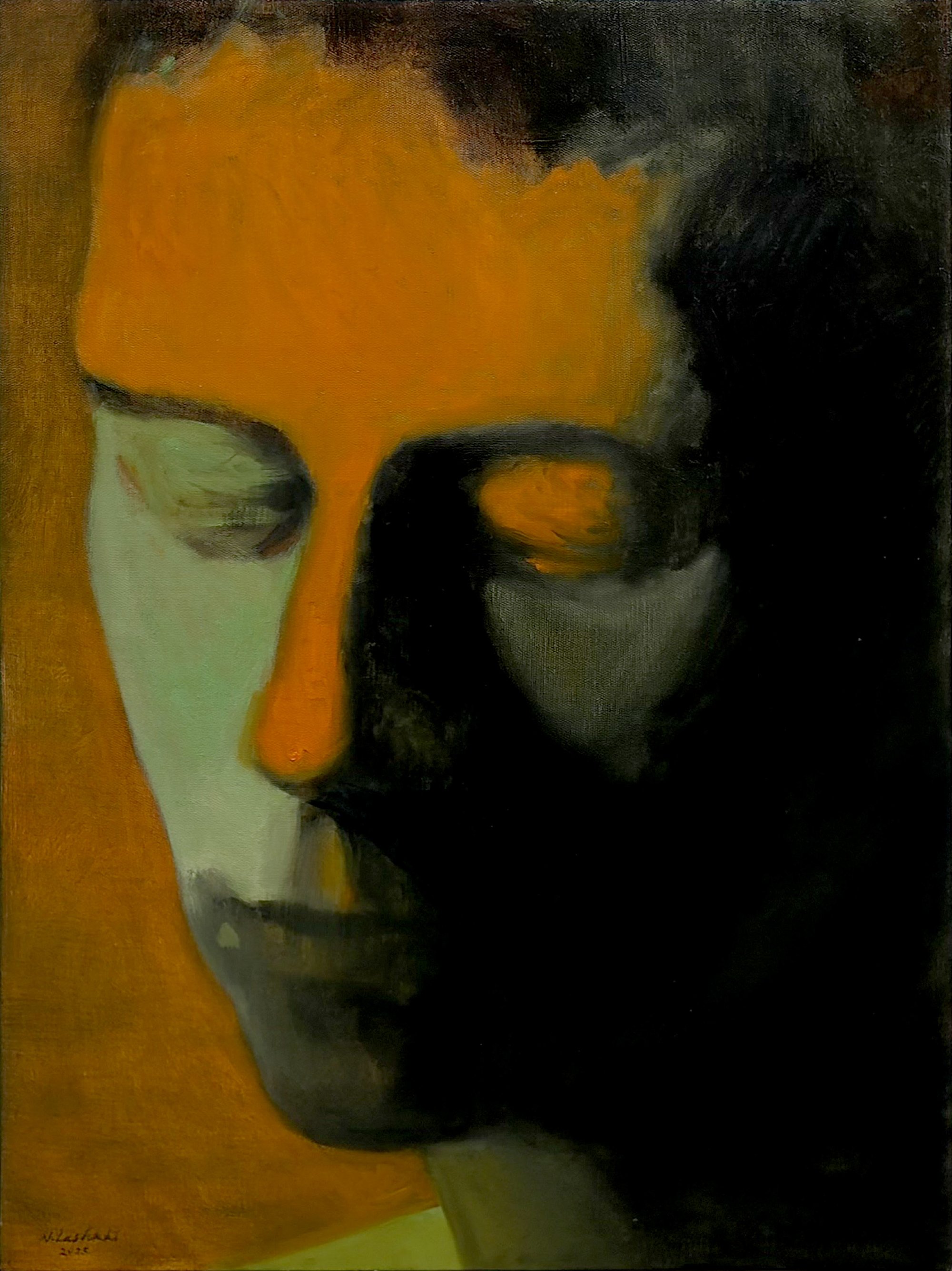 Lashkhi continues her exploration of the human condition through portraiture. Some works coalesce into small series, while others stand alone: a mirrored portrait, a submerged female figure, a contemplative thinker. Particularly striking are the smaller, darker portraits, where personal features of faces recede in importance. Instead, the viewer is confronted with dense brushstrokes and an atmosphere that feels visceral, even otherworldly. The figures seem to hover between the human and the spectral, evoking a sense of unease that is both psychological and metaphysical.