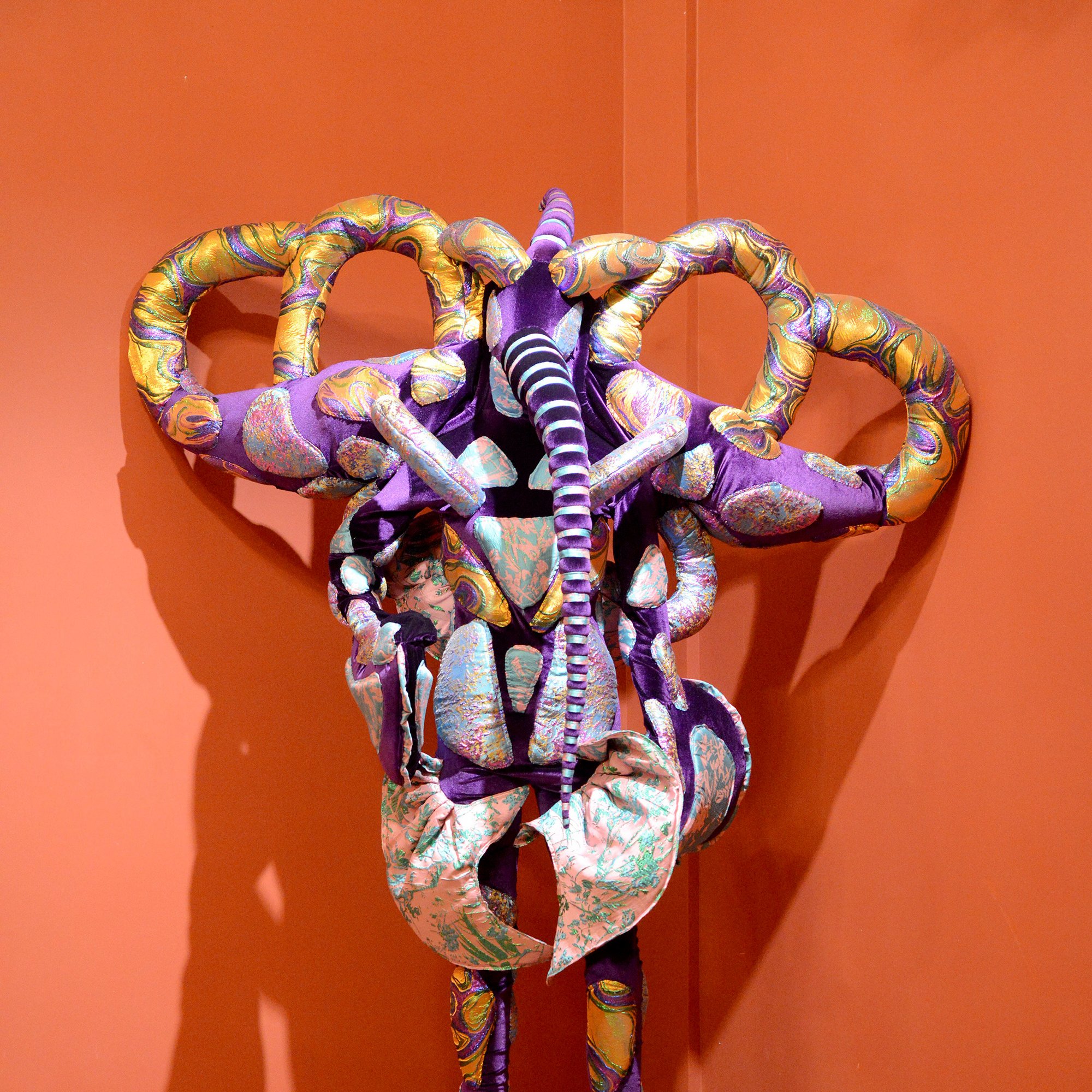 Nearby, Andrey Bartenev (b. 1965), together with a circle of followers and kindred spirits, assembles a miniature museum of kitschy, glitch-inflected sculpture populated by cyber-monsters. These figures seem to have leapt straight from the backstage of the internet, while simultaneously recalling motifs of Soviet modernism. Bartenev himself places in the hall a black-and-white, melted kikimora – a swamp witch – entirely covered in tiny eyes that stare back with the melancholy gaze of humanoids.