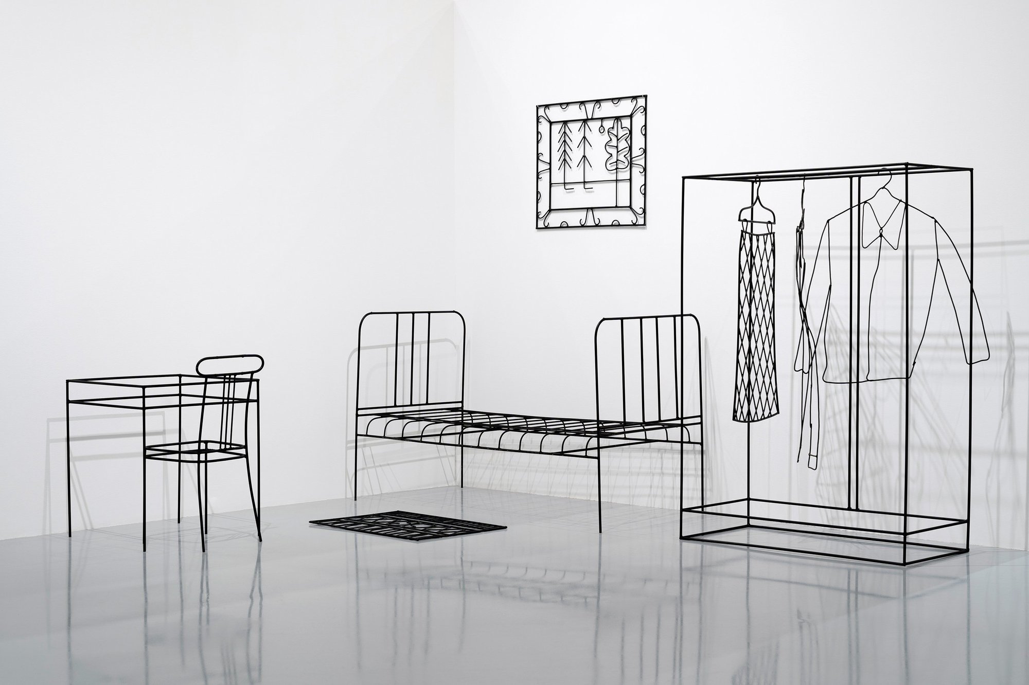 The exhibition highlights three leitmotifs. The first is her framelike furniture, the piercing edges of everyday, seemingly cosy objects that become alienated and bristle like daggers. Here one recalls the existentialist tradition via Camus and his characters who, before execution, suddenly understand how hostile the world has become – the very commonplace world that should have been tamed but, instead, stings and cuts. This tradition can also be traced through Russian art, for instance, in Pavel Fedotov’s (1815–1852) later works when mental illness undermined the artist. Whereas early in Fedotov’s paintings, countless details of everyday life were friendly and helped express the owner’s personality with humour, in late paintings such as ‘Encore, Once More, Encore!’ (1852) a feverish consciousness floods the canvases with an uneven scarlet light, turning every object into something alien, estranged, and ghostly. Anna Zholud attracts allies from this great romantic tradition.