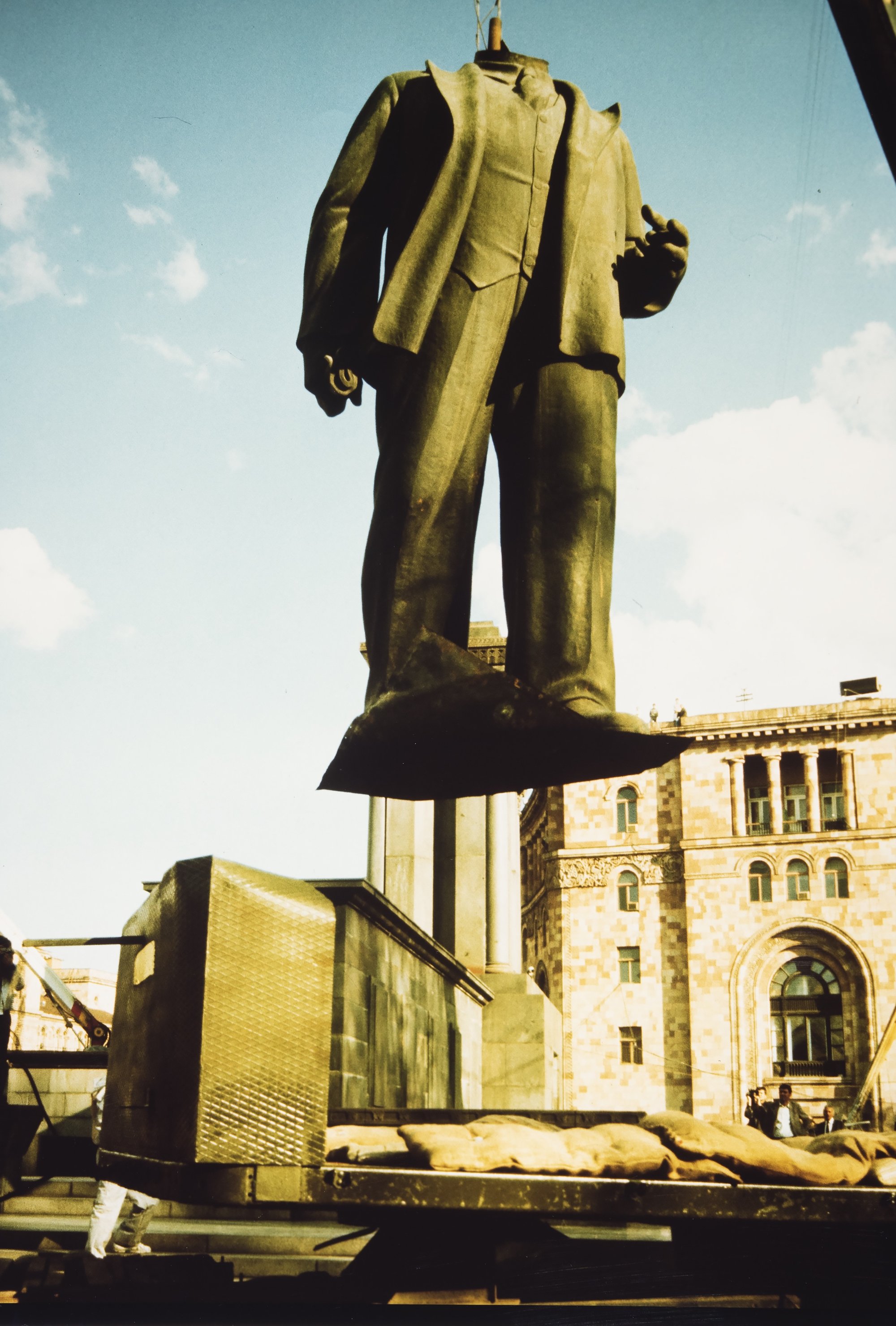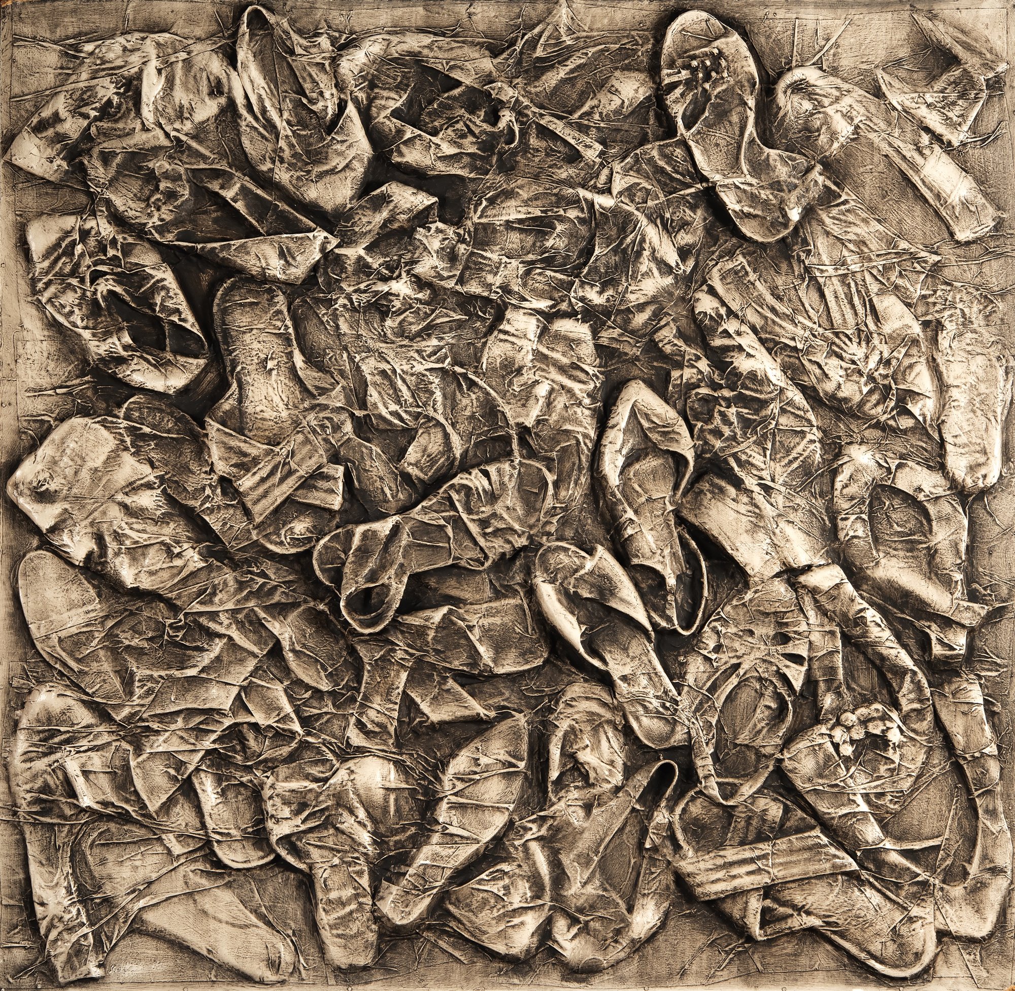 Soviet censorship in Armenia was so relaxed that an artist could bypass it simply by changing the label. This is the story behind Hagop Hagopian’s artwork, which opens the exhibition's darkest chapter, ‘Dystopias of the Evil Empire’. The painting depicts an eerie crowd of headless people rallying on an endless plain, and the anti-Soviet message is so obvious that the artist never intended it to be shown at an officially approved exhibition. However, after reading a newspaper article about the invention of the neutron bomb, he gave the painting the title ‘No to the Neutron Bomb!’. With its message thus aligned with Soviet anti-war propaganda, the painting appeared in many exhibitions. The curators have created an elegant visual rhyme by placing a photograph of a beheaded Lenin statue being dismantled in post-Soviet Yerevan (by Zaven Sargsyan, b. 1947) at the entrance to the exhibition. This striking document and Hagopyan's bold fantasy echo one another, proving that even the most surreal artistic visions can become reality. Other artworks in this section also criticize the Soviet regime indirectly and symbolically. For example, Raffi Adalyan’s (b. 1940) ‘Gulag Archipelago No. 2’ (1984), an assemblage of shoes glued onto a board, evokes the many Holocaust memorials where old shoes have been turned into monuments to their owners, who perished in death camps. The idea that the Nazi and Stalinist regimes employed similar mechanisms of destruction predates the heated public debates about the Great Terror repressions during Gorbachev's perestroika – an era of liberation in the USSR that began in 1985.