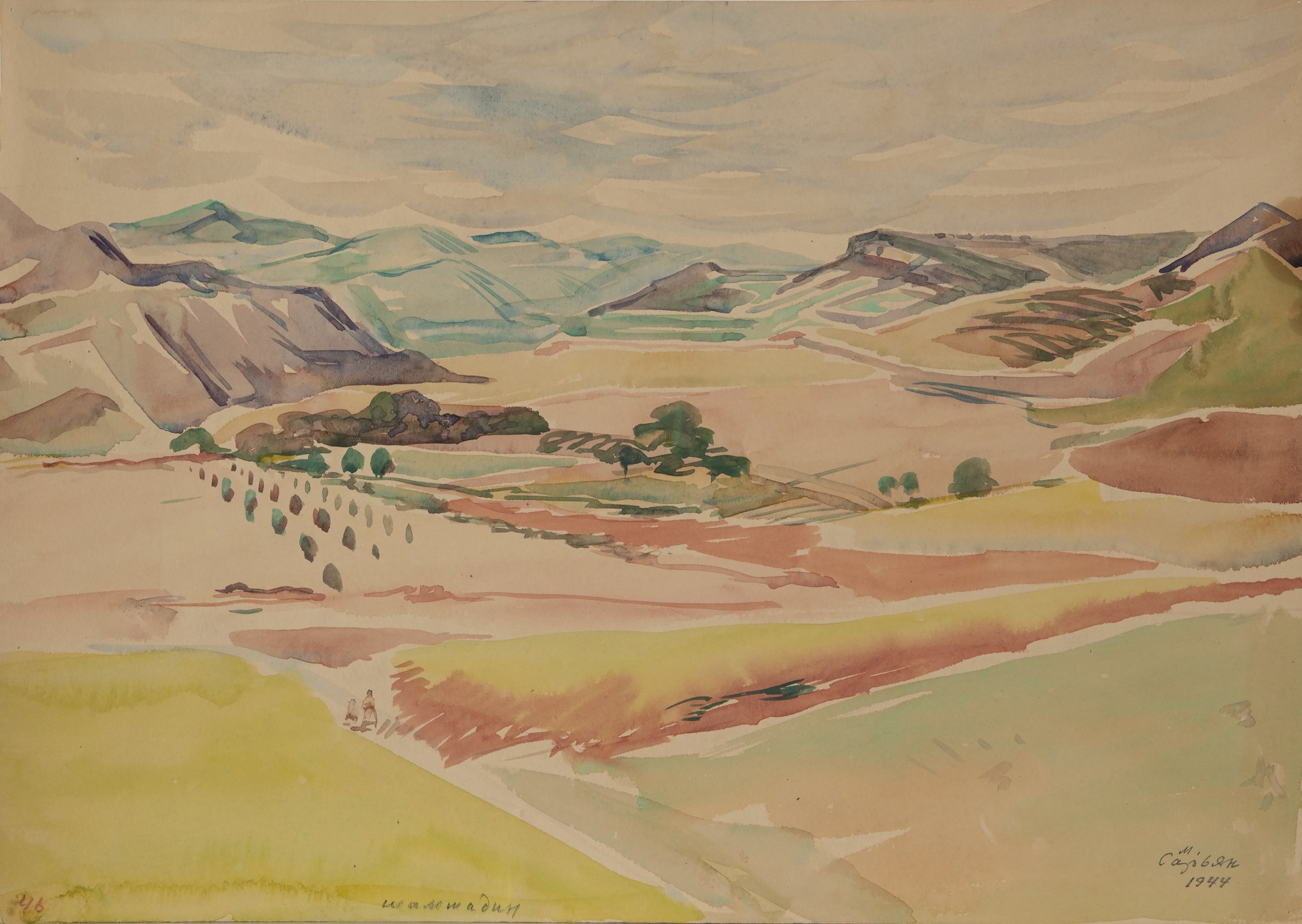 It seems that the boundaries between official and unofficial art were far less rigid in Armenia than in Russia. Many artists followed in the footsteps of Martiros Saryan (1880–1972), a renowned Soviet classic known for the vibrant colours in his paintings. Like their mentor, they attempted to express national identity through landscape. Their works comprise a dedicated section, ‘National Landscape: Land, Identity, Dream’, introduced by a watercolour by Saryan himself. For Armenians, the rugged, barren landscape of their country has strong political significance since their homeland's territory gradually shrank throughout history. Even Mount Ararat, a cherished national symbol, now belongs to Turkey. The recent armed conflict with Azerbaijan over Nagorno-Karabakh makes this section of the exhibition particularly relevant. While many churches in the disputed area have been destroyed during the war, the painting of a church by Armine Galentz (1920–2007), a Syria-born artist who was also a repatriate, looks like a testament to tragic loss and resilience.