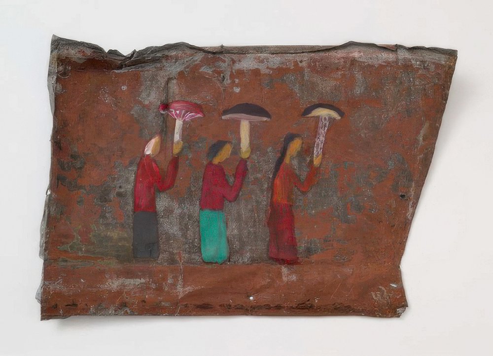 The most striking work near the entrance depicts a procession of three figures in red garments carrying mushrooms, painted on a steel sheet. Another notable piece features a koromyslo (a traditional water-carrying yoke) alongside its painted representation, which may be read as a playful reference to Joseph Kosuth. Yet Zatulovskaya generally resists overt stylisation.