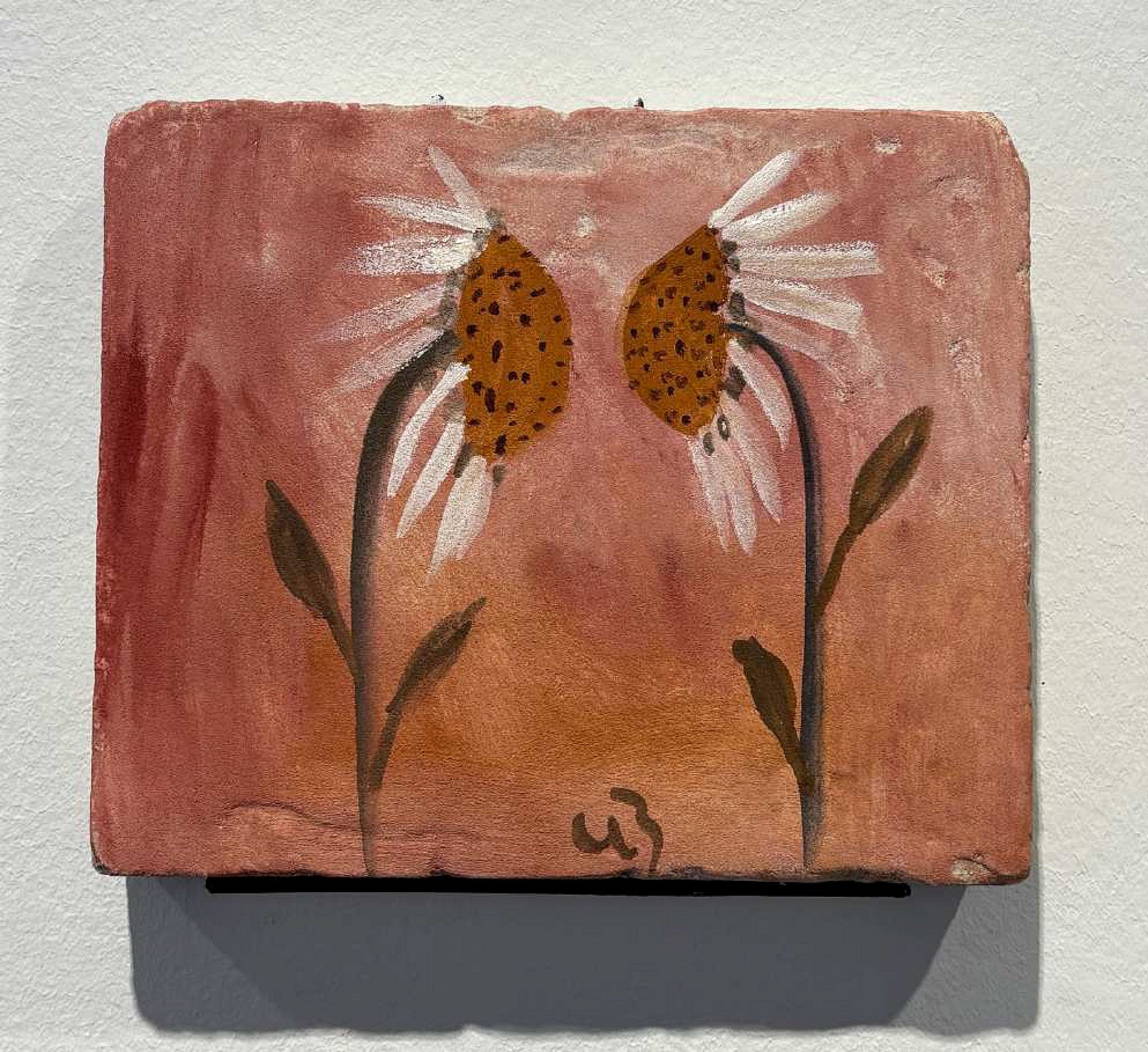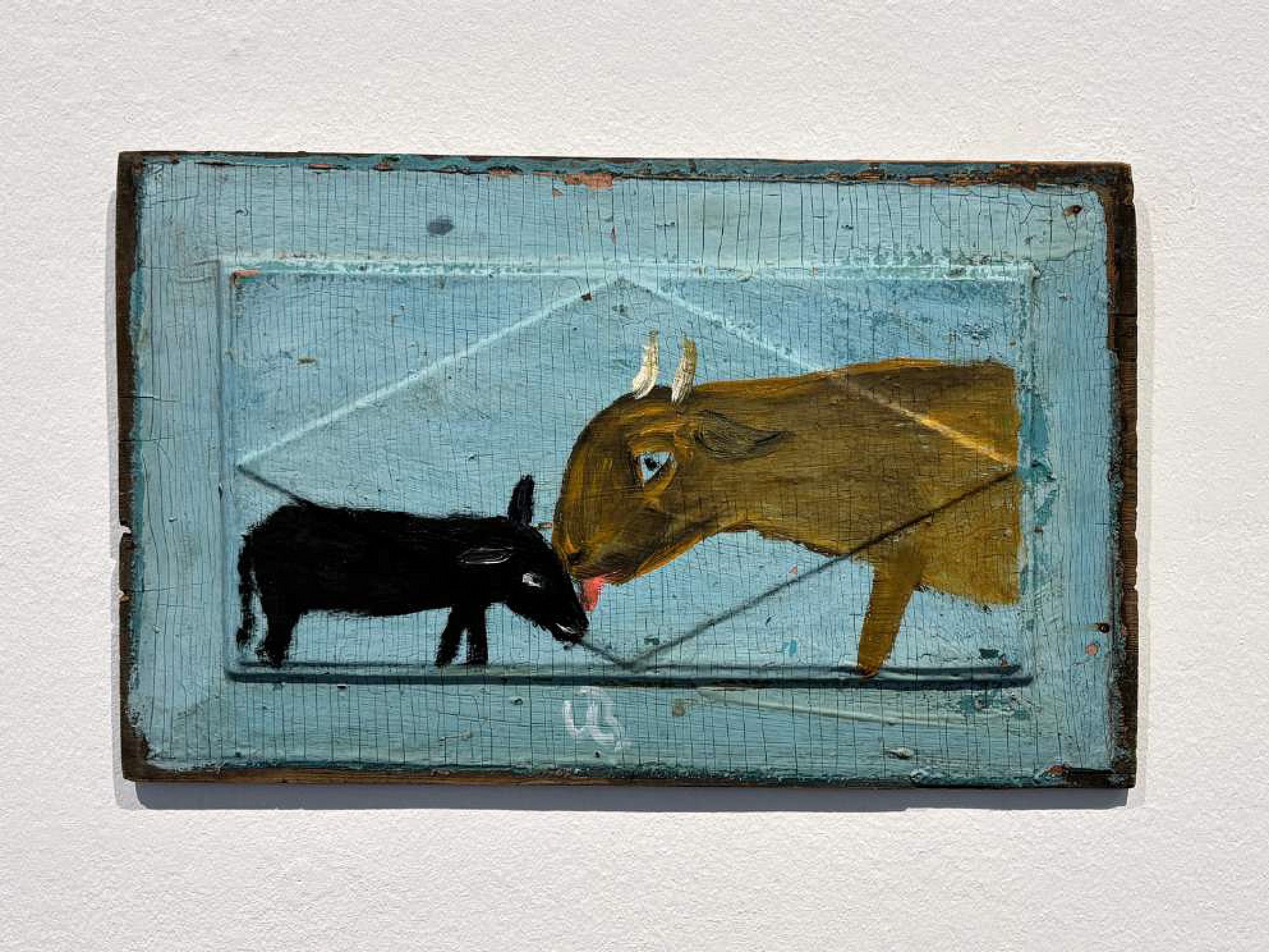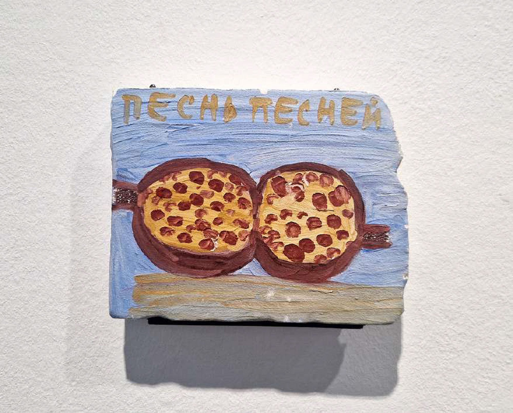 This new exhibition at Galerie Volker Diehl presents a broad spectrum of Irina Zatulovskaya’s recurring subjects, including animals and fruit, a clock, a portrait of Fyodor Dostoyevsky (from her series devoted to revered artists, writers, and poets), a landscape, and several embroideries with evangelical themes. Her characteristic paintings on stone fragments and iron sheets are also prominently represented.