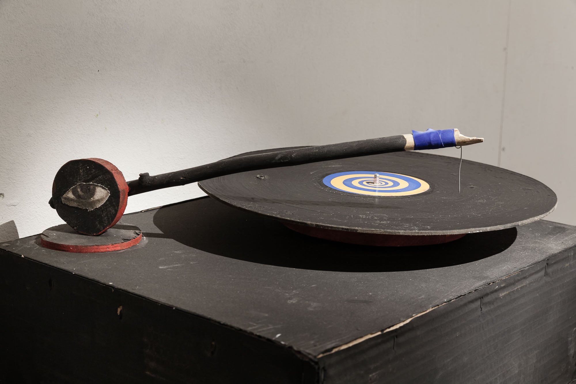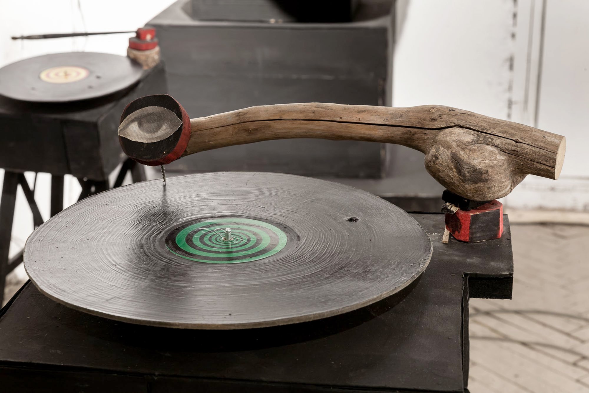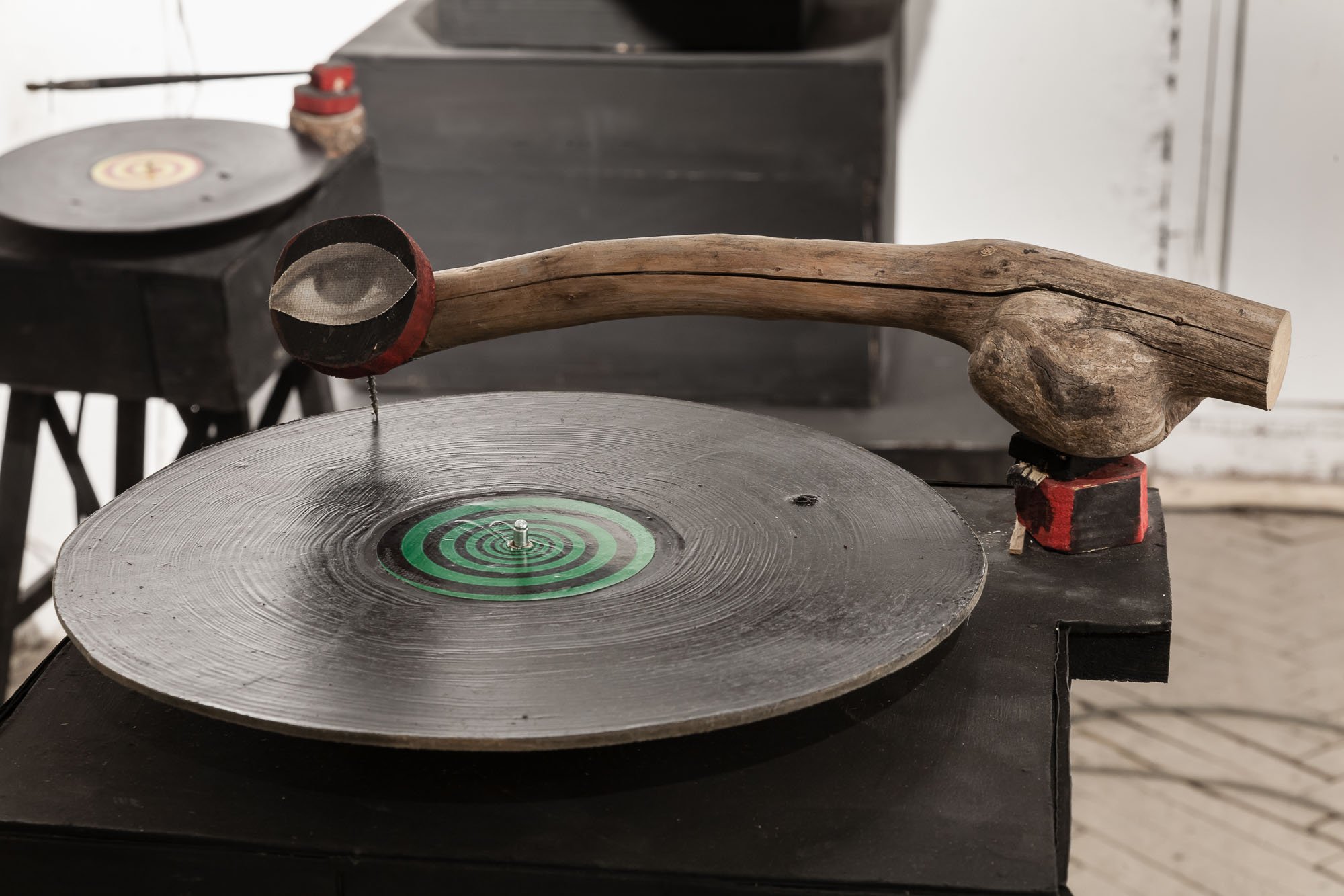 This part of ‘Civilization X’ was staged as a kind of exhibition party with apocalyptic undertones. The space is full of imitation record players and huge gramophones letting out a melody on loop which in turn forms a rondo around one recurring phrase: “All is calm in Baghdad.” This refrain belongs to the Soviet past and to nostalgia for fairy tales. The phrase and the music come from the 1966 film ‘The Magic Lamp of Aladdin’ in which it is sung by the guards; since then and over time, it has become an idiom signifying the fabrication of the appearance of well-being.