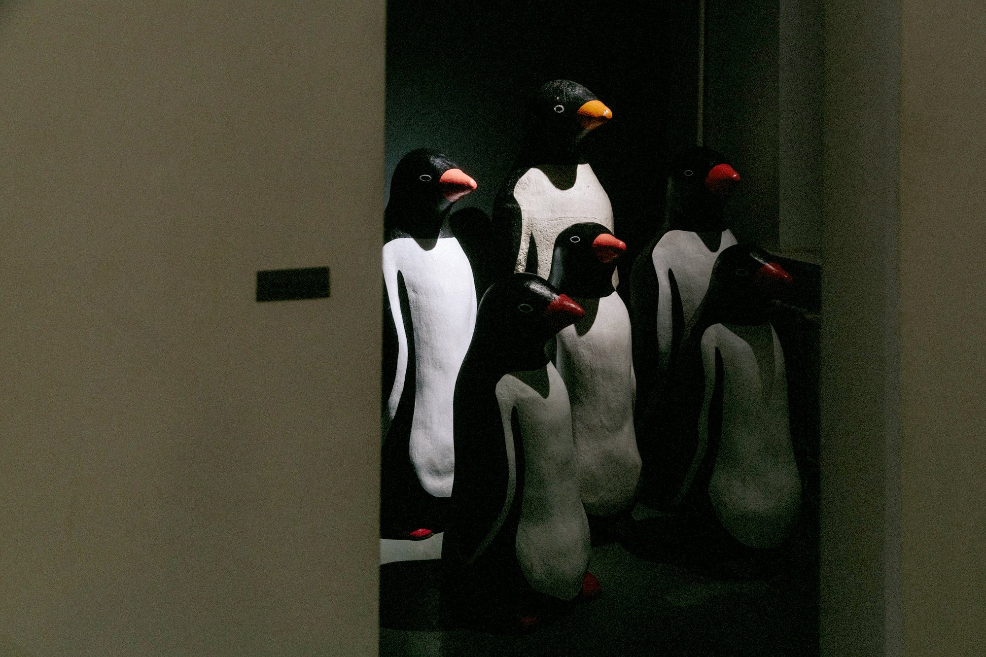 And yes—Rudyev has returned to his penguins. In the gallery, a tiny side room adjoins the main hall, visible only by peering inside. In the doorway, we see a family of penguins. As the artist explains: “I had only one penguin left from a 2006 project, but I decided to give it a family—five penguin children. What are they looking at? At one of Russia’s most overused symbols of the ‘eternally living’—the mummy of Vladimir Lenin in the Lenin’s Mausoleum, which today is periodically subjected to attempts at revival, in the spirit of Luigi Galvani, who famously demonstrated how a dead frog’s leg twitches under electricity. And so this poor family of penguins is forced to watch these convulsions of resurrecting a bygone grandeur.”