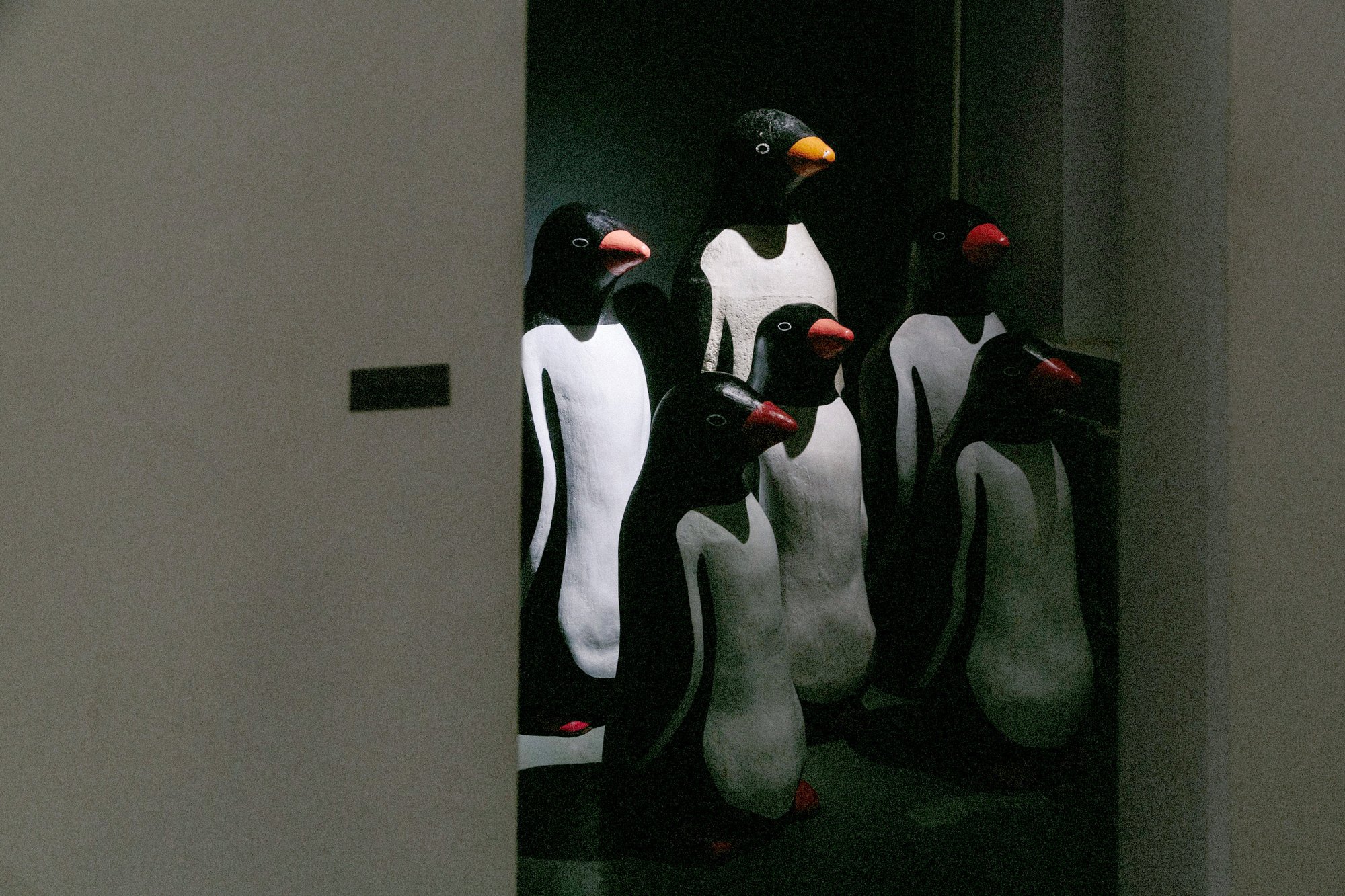 And Rudyev has returned to his penguins. Off the main gallery space there is a tiny side room, visible only if one peers inside. In the doorway stands a family of penguins. As the artist explains: “I only had one penguin left over from a project in 2006, but I decided to give it a family of five little penguin children. What are they looking at? One of Russia’s most overused symbols of the ‘eternally living’: the mummy of Vladimir Lenin in Lenin’s Mausoleum, which today is periodically subjected to attempts at revival, in the spirit of Luigi Galvani, who famously demonstrated how a dead frog’s leg twitches under electricity. And so this poor family of penguins is forced to watch these convulsions of resurrecting a bygone grandeur.”