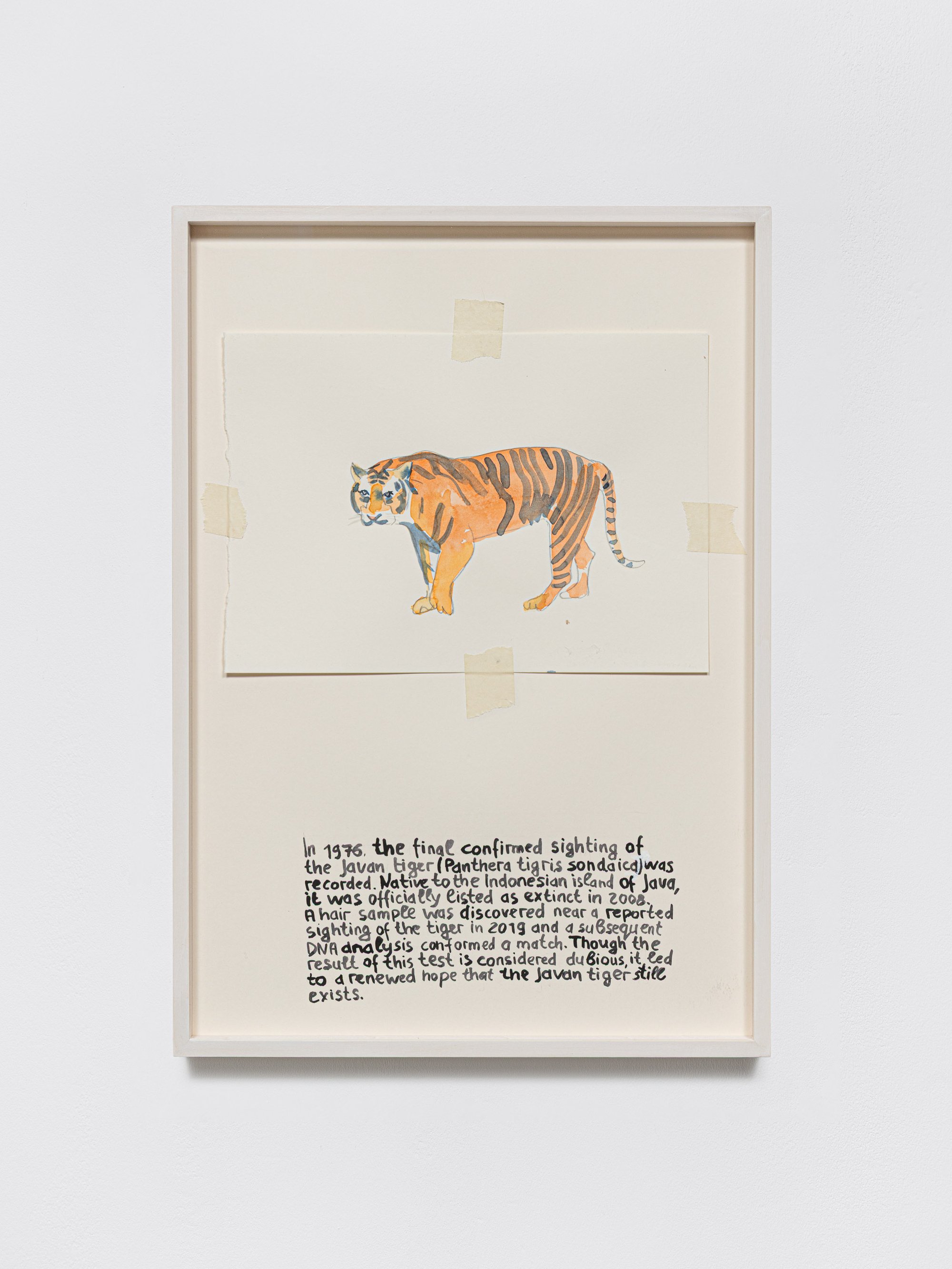 The large wall to the left of the entrance features a site-specific watercolour installation titled ‘Last Seen Since 1970’ (2025–ongoing), with each image representing a species believed to have become extinct since the date referenced in the title. This unsettling coexistence with endangered birds, reptiles, and mammals forms part of a broader thread running through the artist’s practice: a call for empathy and for a better chance for those unable to defend themselves. That appeal may speak equally to animals and to human refugees – like the artist herself earlier in life.