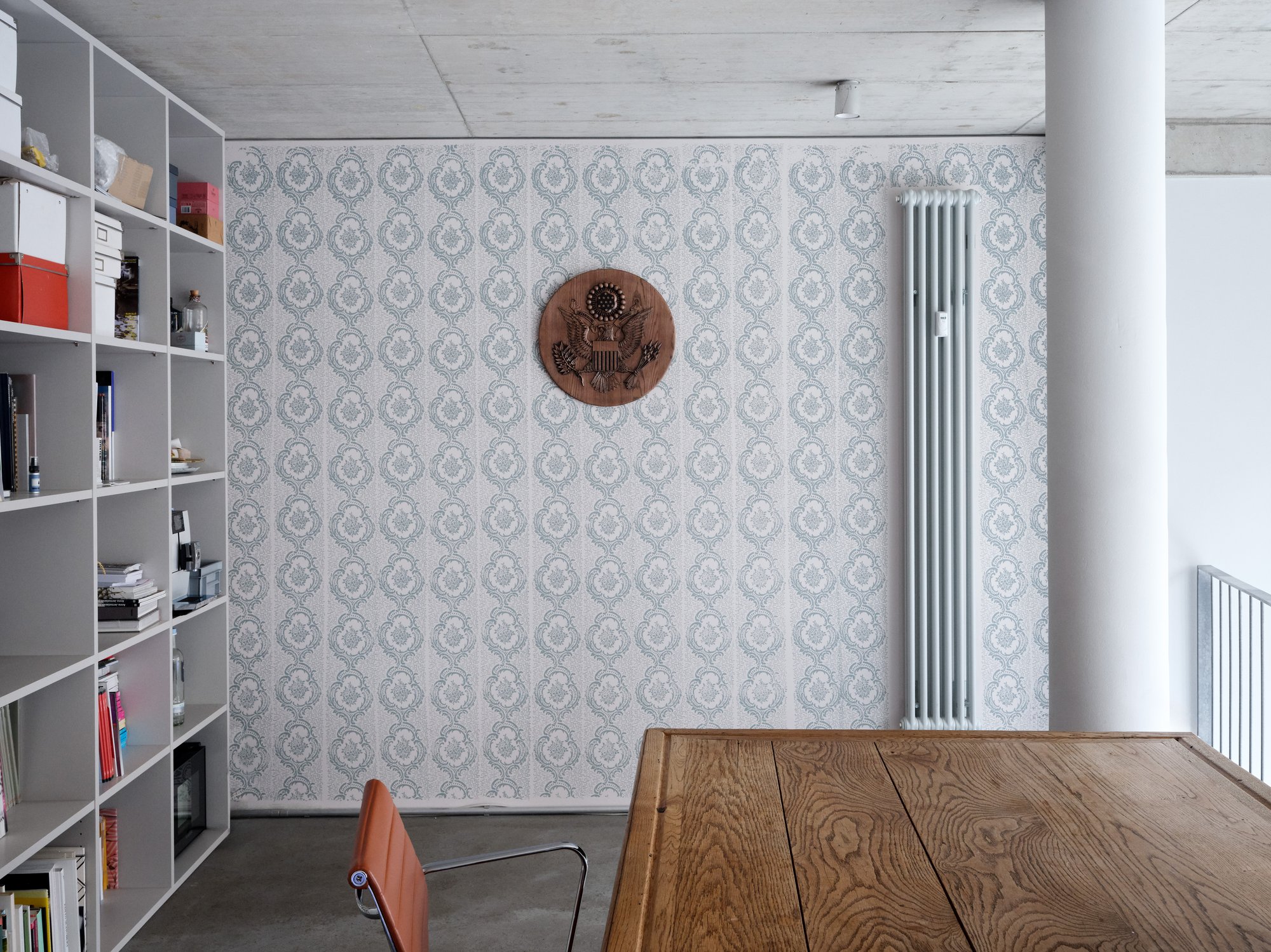 Finally, the new body of work also shown at Molitor is titled ‘The Smart Gift Series’. These are relatively small objects installed in the office space on the first floor. ‘Panda-Diplomatie’ (2026) is a stuffed toy displayed in a glass case, referring to China’s well-known use of panda loans as a means of fostering diplomatic ties – even though all pandas remain the property of the Chinese state. ‘The Thing’ (2026) is a wooden replica of the US Great Seal presented in Moscow in the 1940s to the American ambassador by a delegation of children from the Young Pioneer Organization. Only years later was it discovered that the object concealed a listening device ingeniously designed by Lev Termen, the inventor of the theremin. In German, the word ‘Gift’ means “poison”, so the title of the series becomes a pointed pun.