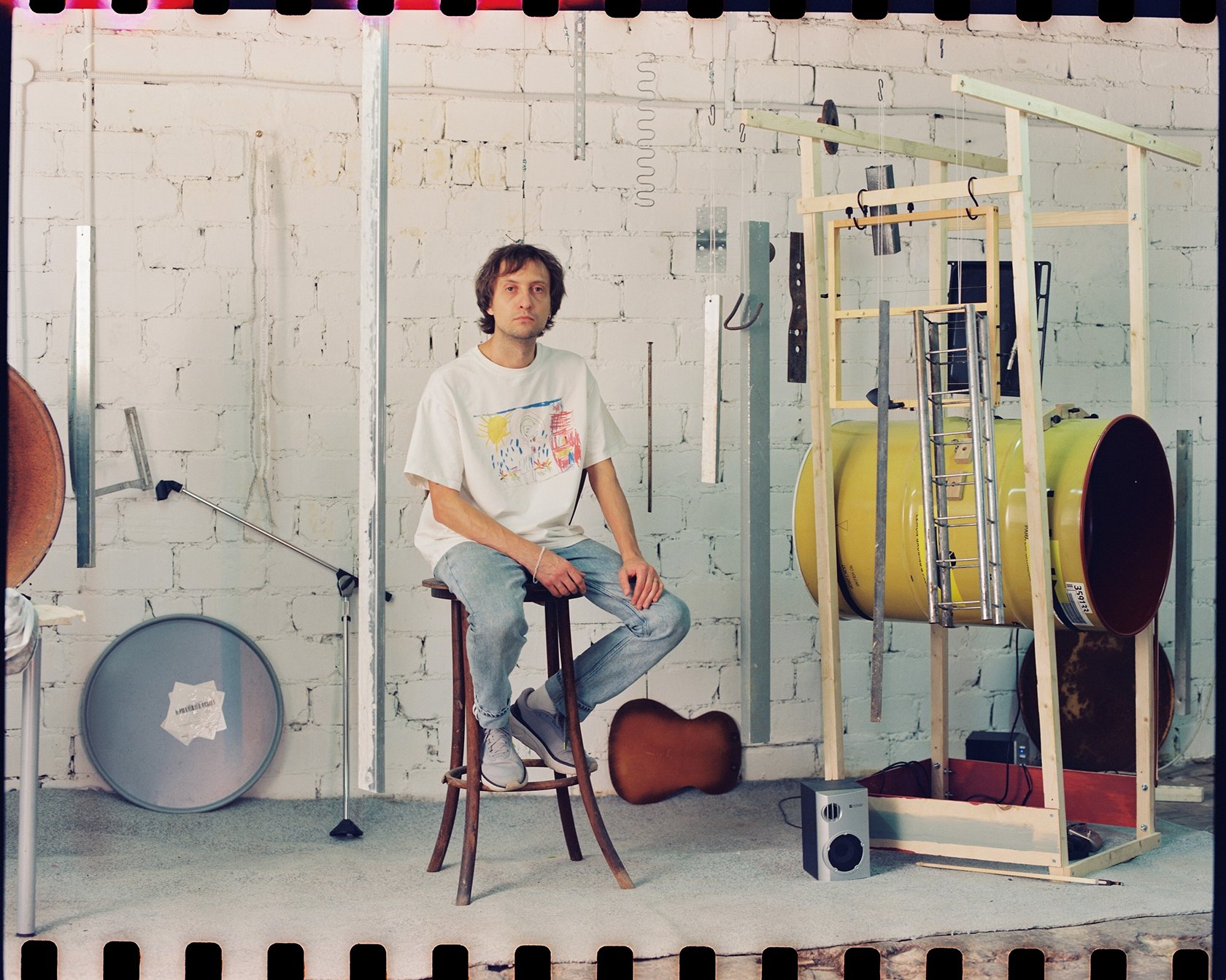 Grankov aspired to become an artist from an early age. “Back then, I still thought that an artist was simply someone who draws,” he recalls. “Later, I developed the idea of combining music with contemporary art. I imagined it as musical performance infused with elements of performance art.” The concept of creating sound objects emerged during the pandemic, when Grankov was spending lockdown in the countryside while studying online at the Free Workshops, the contemporary art school of the Moscow Museum of Modern Art. It was there that he produced his first “barrels”: empty canisters stretched with strings and, in some cases, fitted with fingerboards. For these initial works, Grankov was awarded the Kuryokhin Award in 2021, one of Russia’s most prestigious prizes for contemporary art and music.