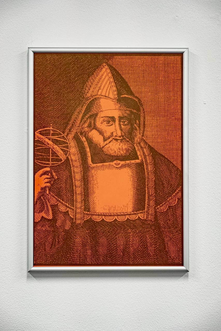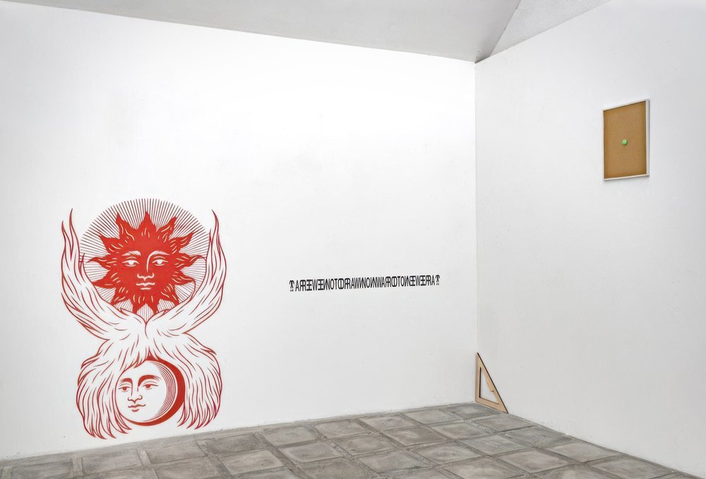 Geometry and cells are fundamental concepts for this laboratory-exhibition. Guided by Proclus Diadochus’s commentaries on Euclid’s ‘Elements’, surveyor-Polshchikov establishes mobile, penetrating connections between chaos and order, the material and the incorporeal, the concrete and the abstract. A sheet with ruled squares and a hallucinogenic, infrared portrait of Hermes Trismegistus are hanging opposite the serpent-jailer of souls. It too is reproduced from an ancient treatise. The presence of the ‘Thrice-Greatest’ (Trismegistus) prophet and astrologer, who linked the pagan and Christian worlds, pleasantly liberates the imagination on themes of magic, alchemy, the secret encrypted in the obvious. From the threshold of the room one can see part of another engraving enlarged to the size of a fresco. At the top the Sun, below the Moon amongst crossed wings.